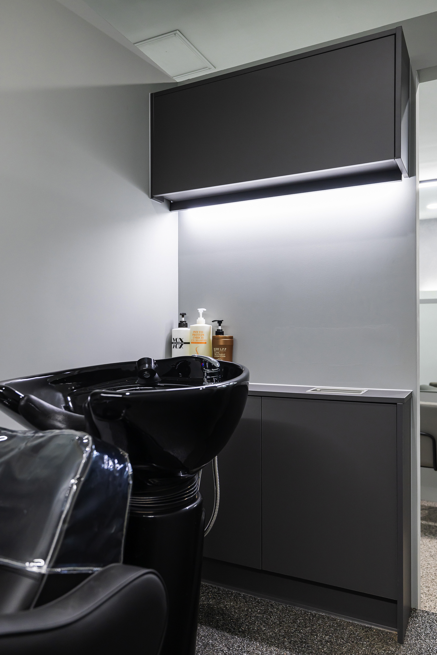 샴푸실은 고객이 가장 편안함을 느껴야 하는 공간이기에 블랙톤의 샴푸 의자를 배치하여 안정감을 극대화했습니다.