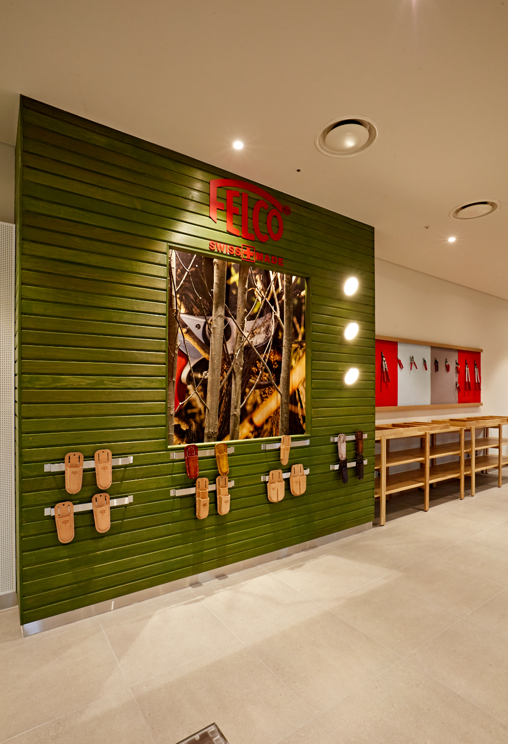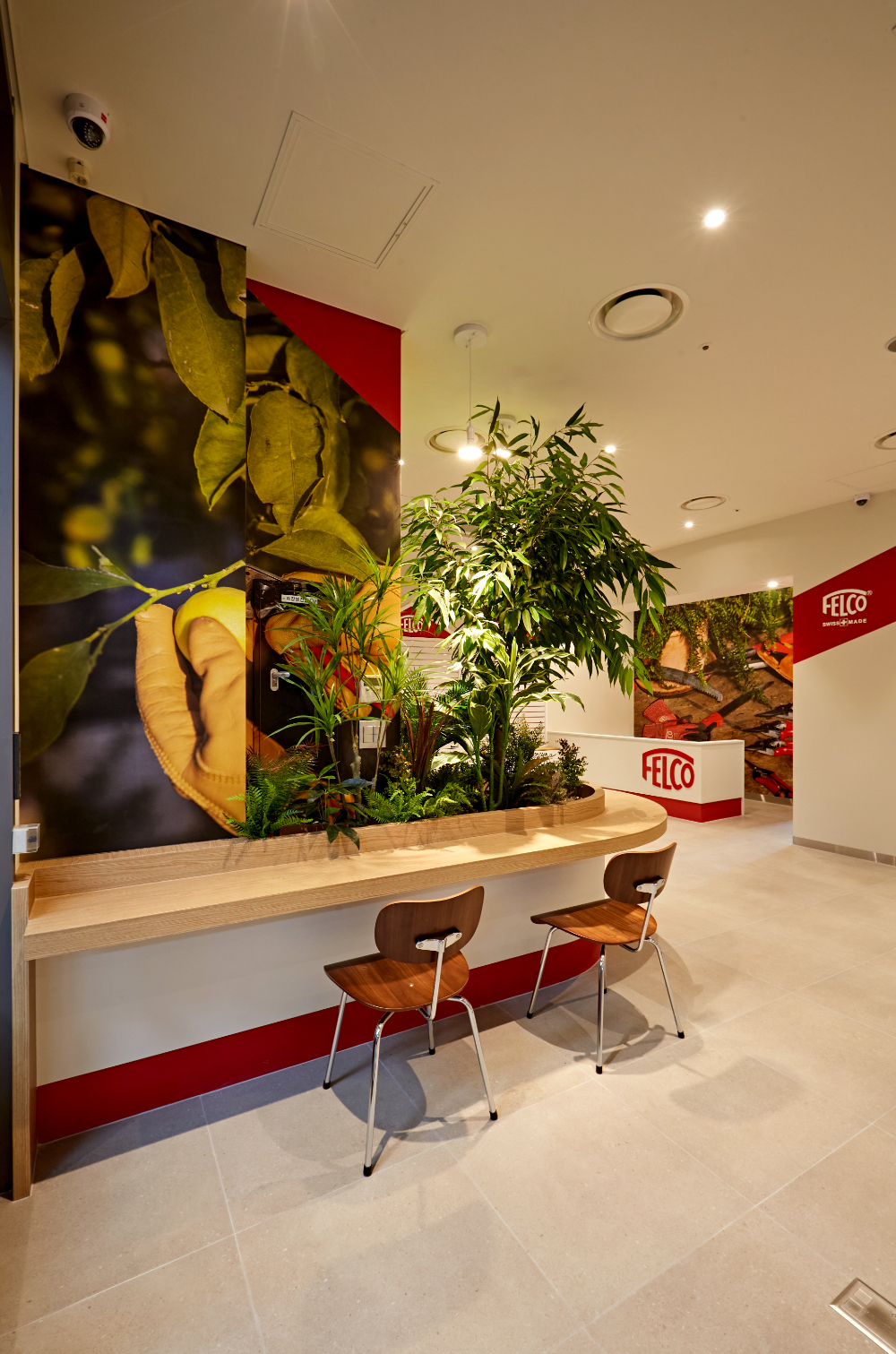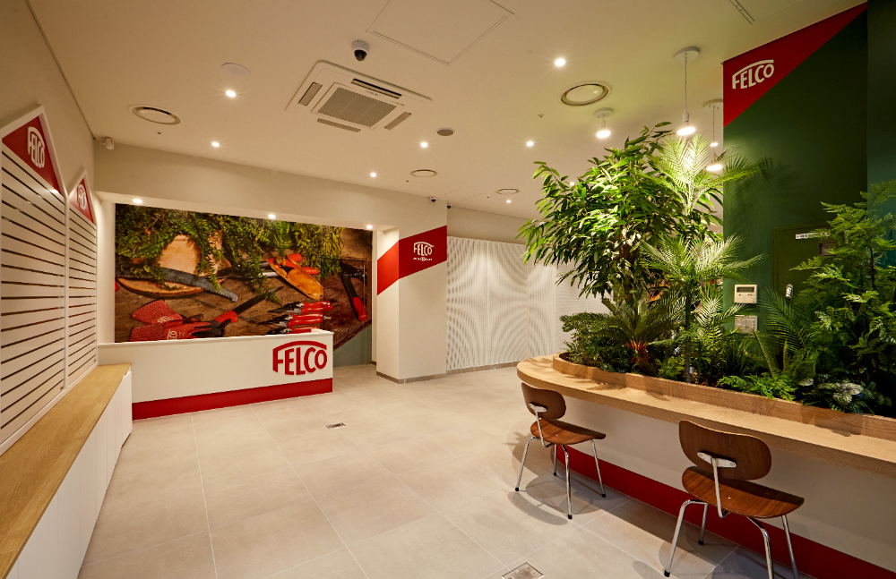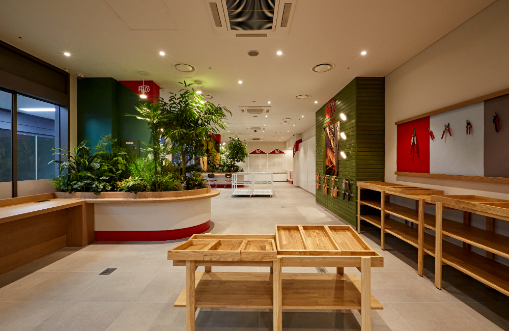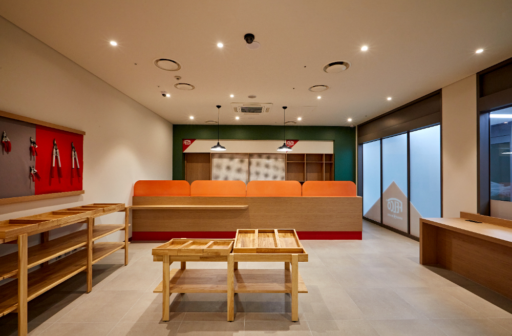 공간은 다양한 물품을 디피하면서도 고객들이 앉아 있을 수 있고, 직원들이 편하게 이용할 수 있도록 다양한 테이블과 선반이 마련되었습니다. 반타원형 테이블에는 상단에 정원이 꾸며져있기도 하고, 벽선반에는 아래는 수납장 위에는 창문형태의 조형물이 디테일을 잡고 있습니다.