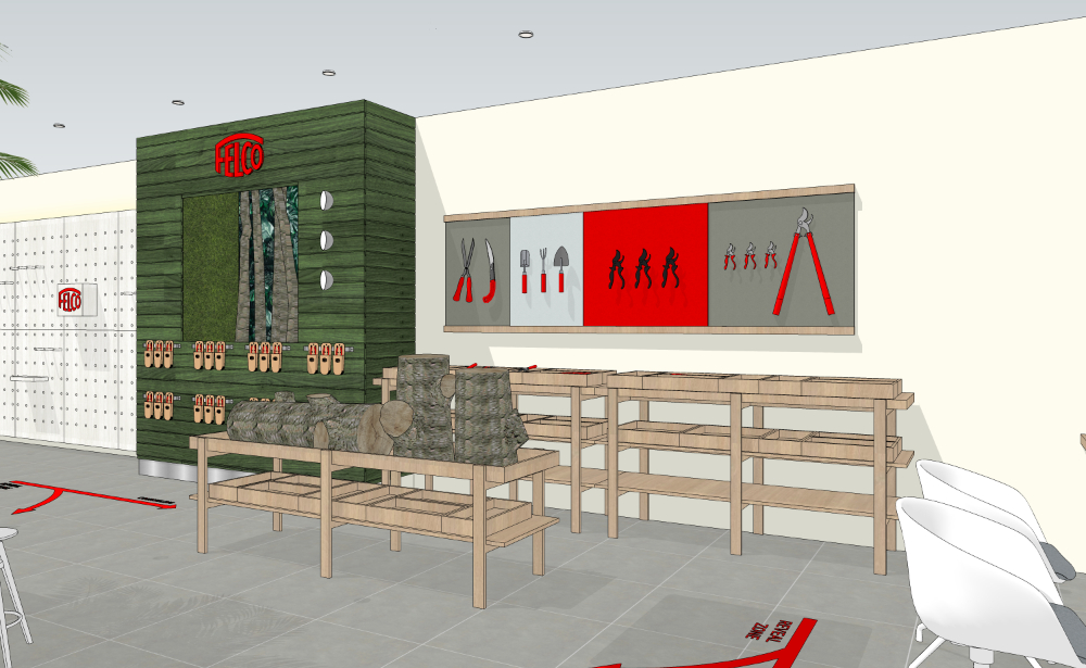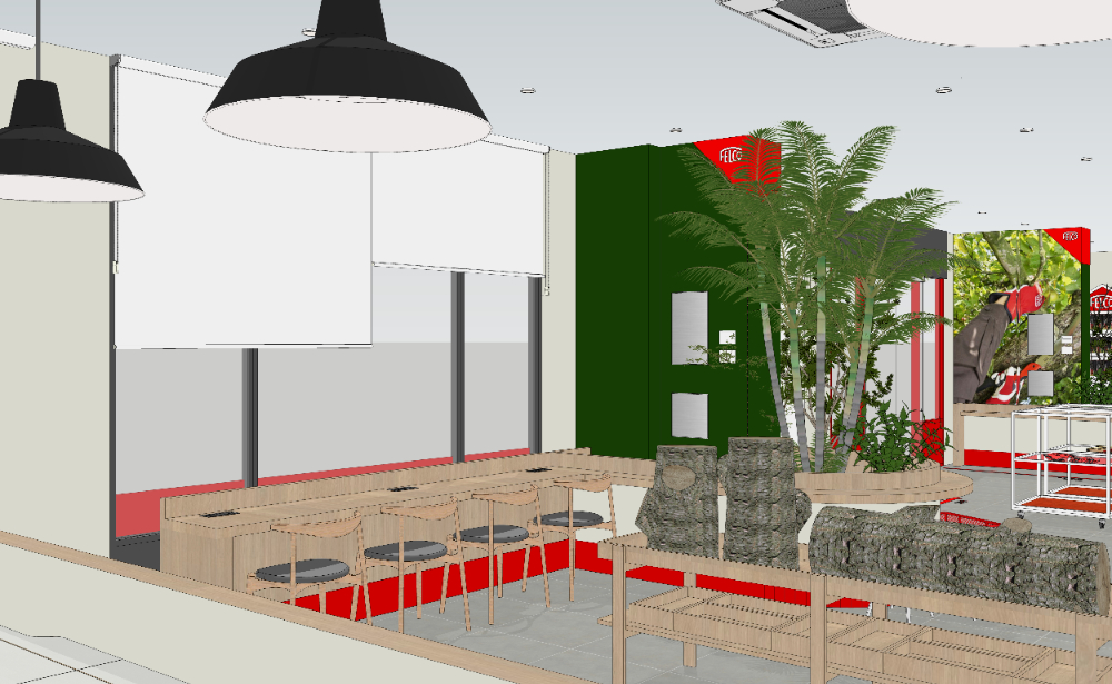 내부에는 독특한 형태의 공간들이 줄지어 있으며, 고객들이 편하게 제품을 둘러볼 수 있고 직원들도 근무를 할 수 있도록 배치에 많은 신경을 썼는데요. 또한, 아이보리와 레드 컬러의 조합이 가장 큰 특징이라는 것을 한 눈에 알 수 있습니다. 이렇게 3D 디자인만으로도 개성이 느껴지는 공간인데요.