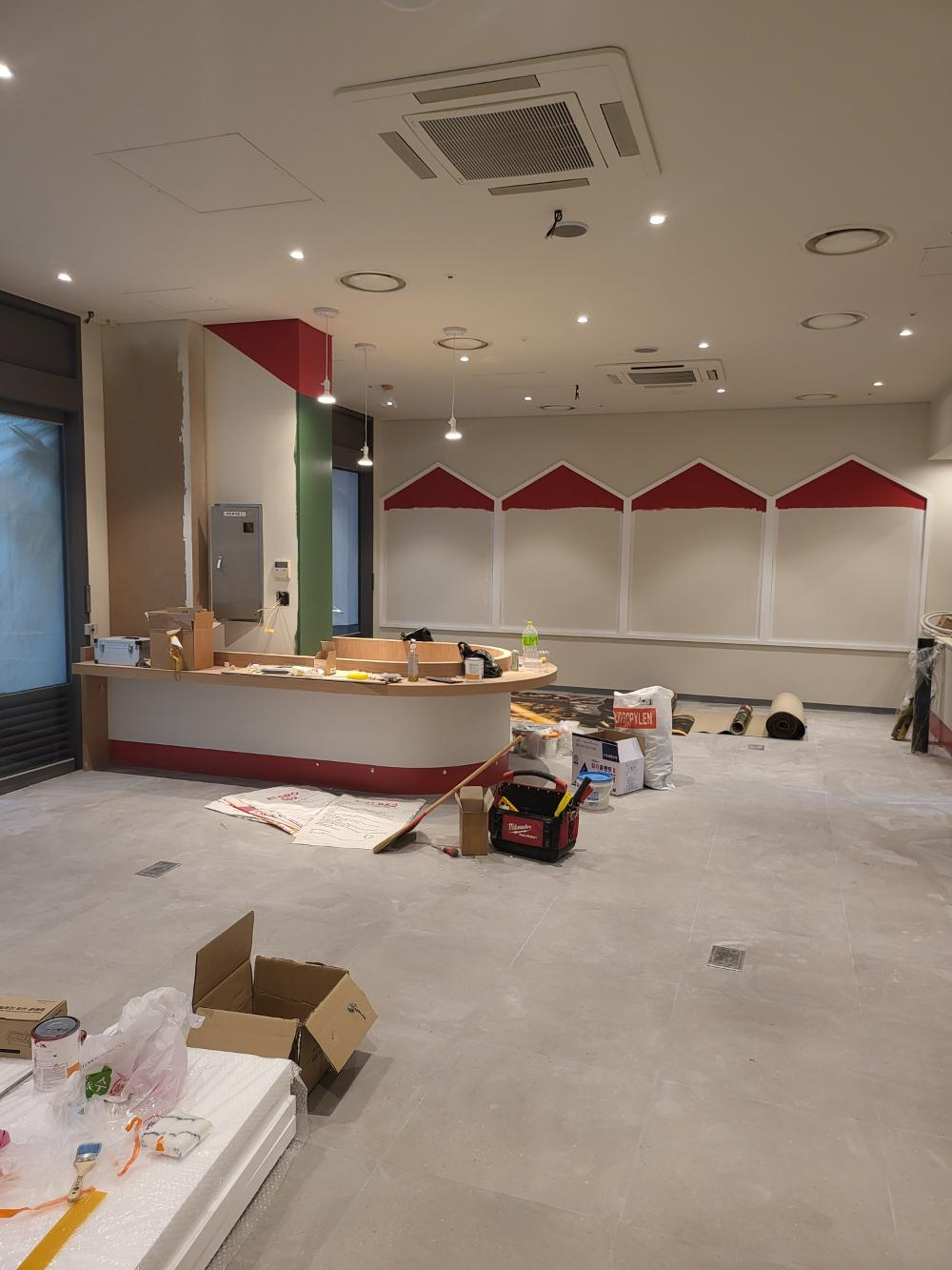 카운터 공간으로 만들어진 곳은 뒤에 화려한 그림으로 아트월이 만들어져 해당 매장의 컨셉을 다시 한번 명확하게 인식 시켜주는데요. 그리고 모든 컬러가 화이트와 레드로 통일되었다보니, 트렌디한 느낌을 줍니다. 조명은 밝게 하는데에 초점을 두기 보다는 다운라이트로 곳곳에 무드를 형성하는 정도로 설치하였습니다.
