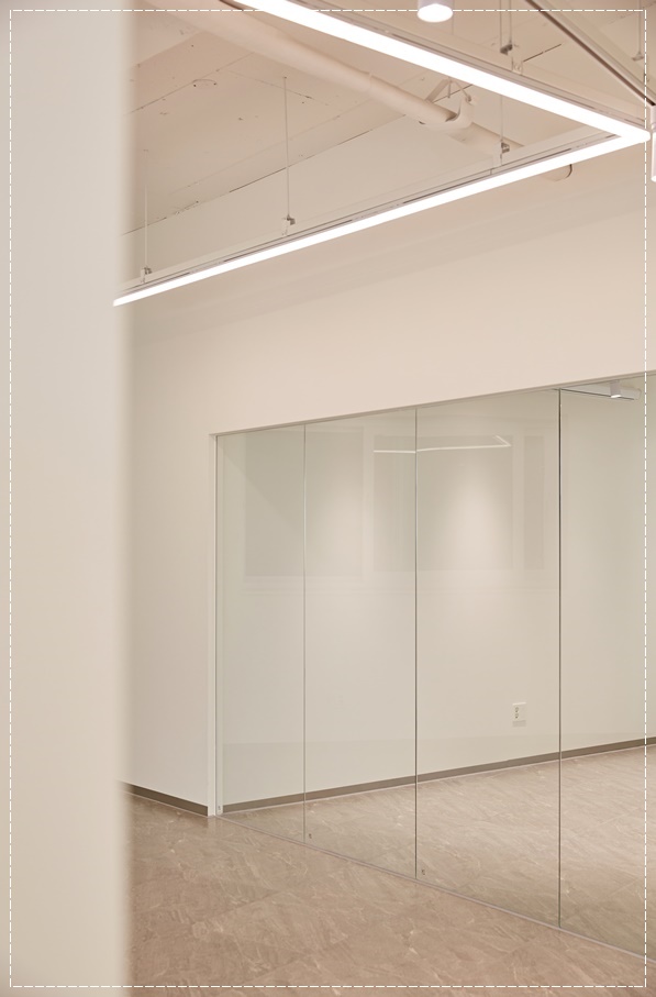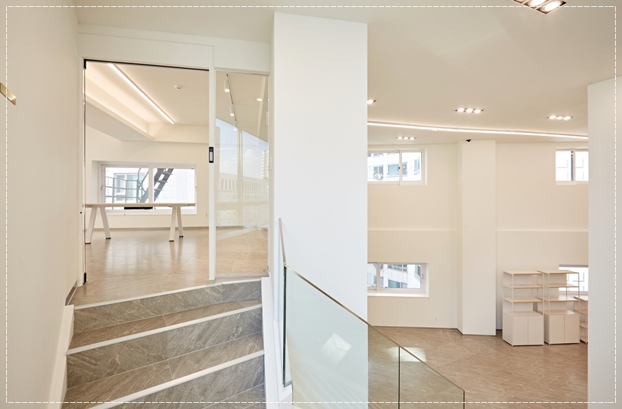 복층 공간은 사무실 전체 흐름을 따라 공간도 흐르게 했고 노출 천장으로 시공해 공간이 커 보이게 했으며 레일 조명을 시공해 위치와 각도를 조절할 수 있도록 했습니다. 목공 프레임과 유리 가벽으로 깔끔하면서 세련되게 공간을 분리해 어떤 공간으로도 자유롭게 활용할 수 있도록 시공했습니다.