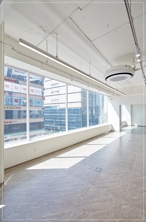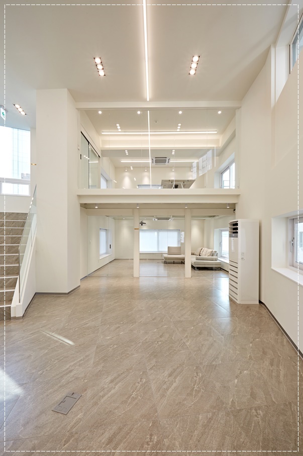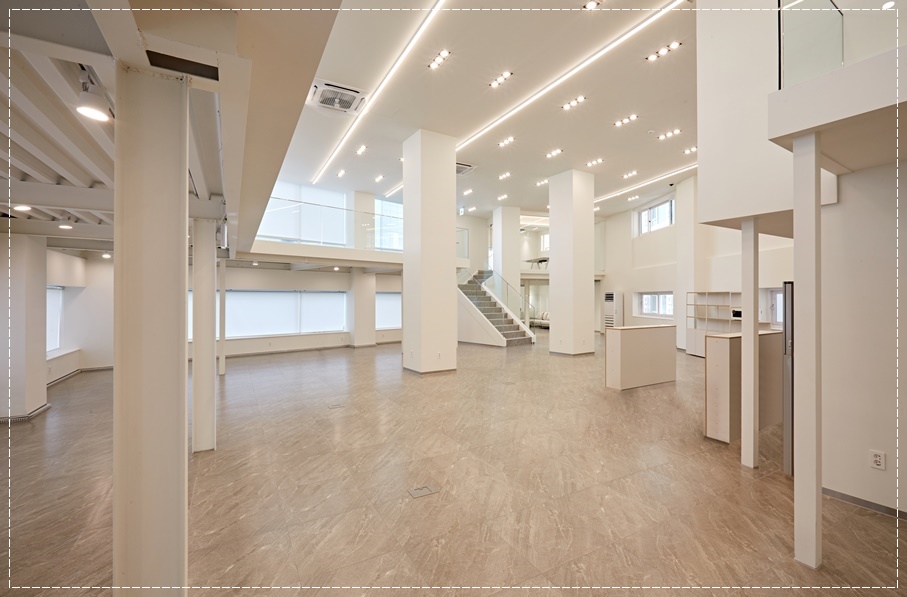 공사가 완료된 모습을 살펴 볼까요?화이트로 마감된 전체적인 분위기는 깔끔하면서 바닥의 브라운톤 데코타일이 안정감을 주고 있습니다. 천장 마감 또한 화이트여서 창문으로 들어오는 자연광이 비추면서 화사하고 넓어 보이게 하네요. 벽면을 따라 창문이 있어 햇빛을 충분히 받을 수 있어 천장이 높아 조도가 약한 복층 사무실의 단점을 보완해주고 있습니다.
