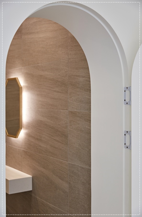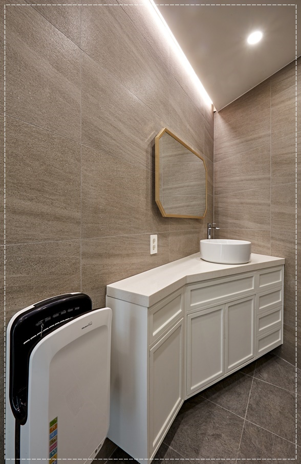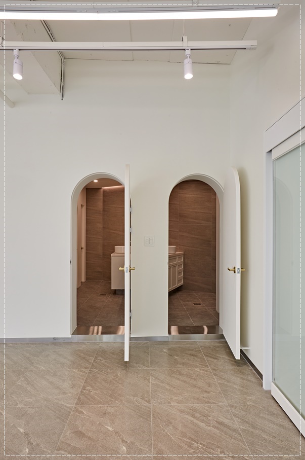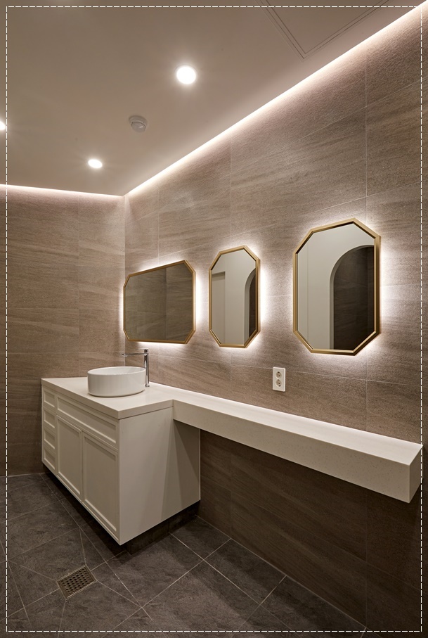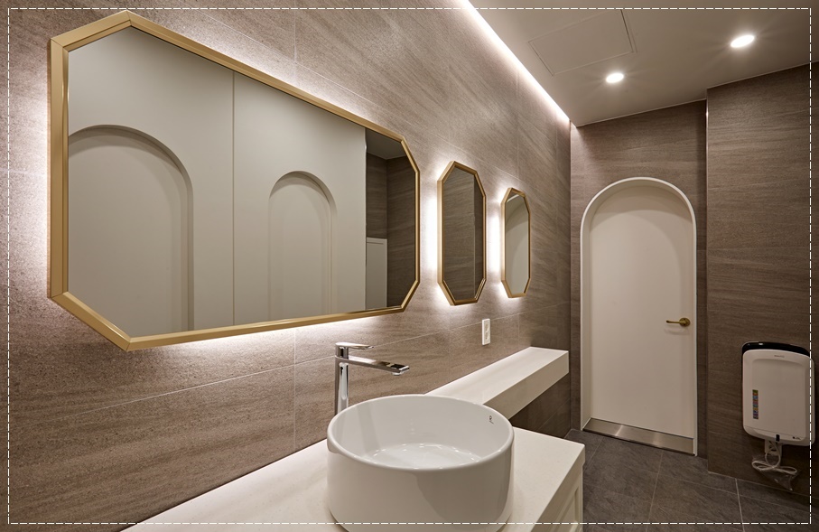 화장실은 남녀를 구분해 시공해드렸습니다. 출입문은 최근 유행하고 있는 아치형으로 시공해 아기자기하면서 부드러운 분위기를 내도록 했고 내부는 고급스러운 타일로 마감해 반전 매력을 느낄 수 있도록 했습니다. 후광 조명을 도한 벽면 거울과 천장 간접조명이 은은하고 아늑한 분위기를 만들어 심리적 안정감을 느낄 수 있도록 합니다.