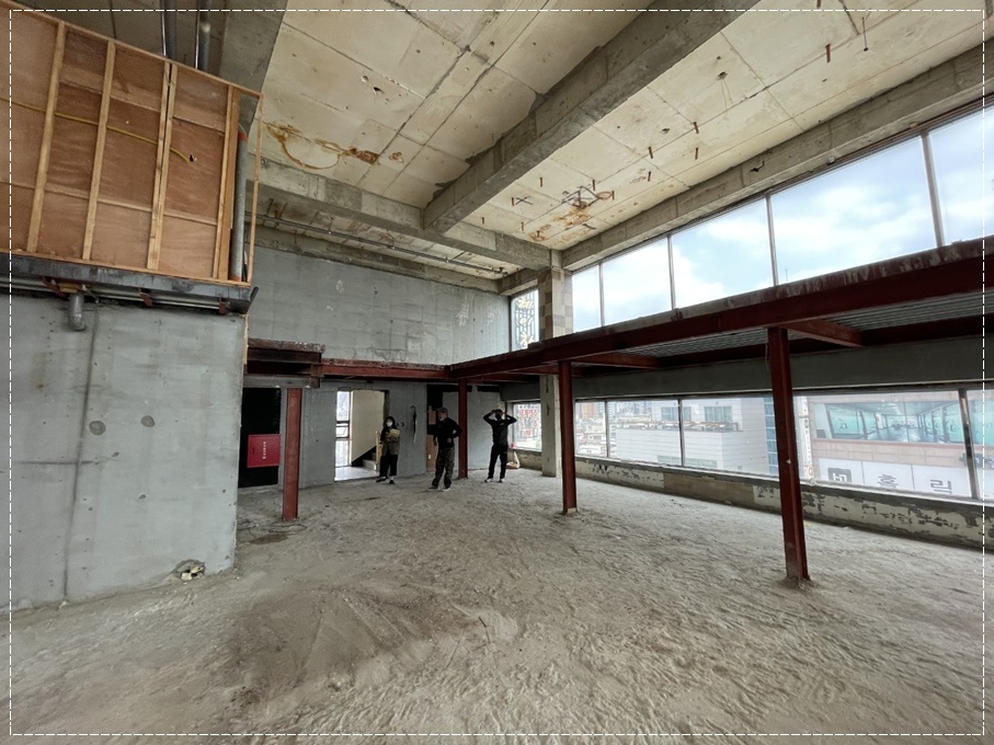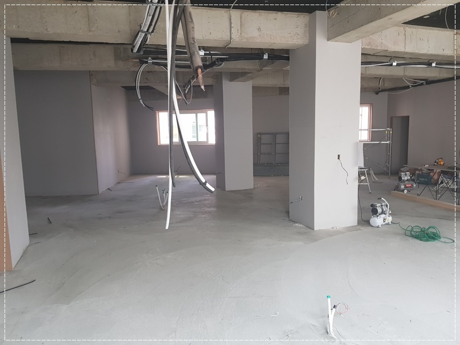 이번 현장은 복층으로 계획해 하단부는 휴게 및 방문객 응대 공간으로 활용하고 복층은 사무공간과 교육공간으로 활용할 예정입니다. 복층 시공은 면적을 1.5배 이상 넓게 사용할 수 있는 장점이 있지만 층고가 확보되지 않으면 오히려 답답해 보이는 단점이 있어 충분한 층고를 확보한 신축 건물이나 지식산업센터에 많이 시공되고 있습니다.