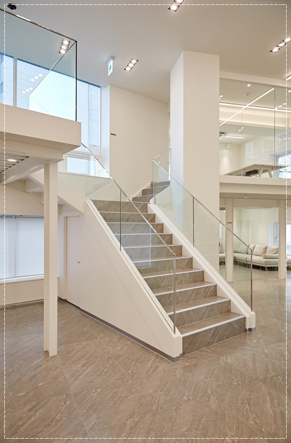 복층으로 올라가는 계단은 전체 인테리어와 매치되도록 화이트 컬러를 적용하고 바닥 마감과 동일한 브란운톤 타일을 적용해 마치 처음부터 한 세트인듯 자연스럽게 시공했으며 유리로 펜스를 만들어 공간의 단절을 막으면서 이용자의 안전을 배려했습니다.