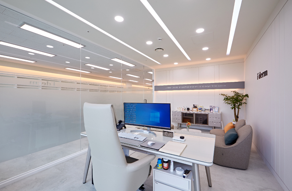 대표님이 지내시는 CEO룸은 창문쪽에 메인 테이블을 배치하고, 앞쪽에는 간단한 담소를 나눌 수 있는 공간을 마련했습니다. 그리고 전체 벽면을 깔끔하게 도장함과 천장에는 라인조명으로 이어지면서 계속해서 선을 사용하는 것을 볼 수 있는데요. 선을 활용한 디자인은 공간이 확장되어 보이는 효과가 있습니다.
