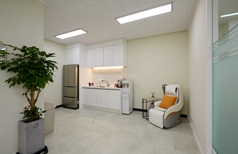 아트월 바로 뒷편에는 조그마한 ㄱ자 구석에 탕비실이 마련되어 있습니다. 별도로 도어를 설치하지 않아서 답답함을 줄였는데요. 또한, 자칫 지저분해보일 수 있는 곳이 탕비실인만큼 살짝 안으로 숨기면서 위생적으로도 고려하였습니다.