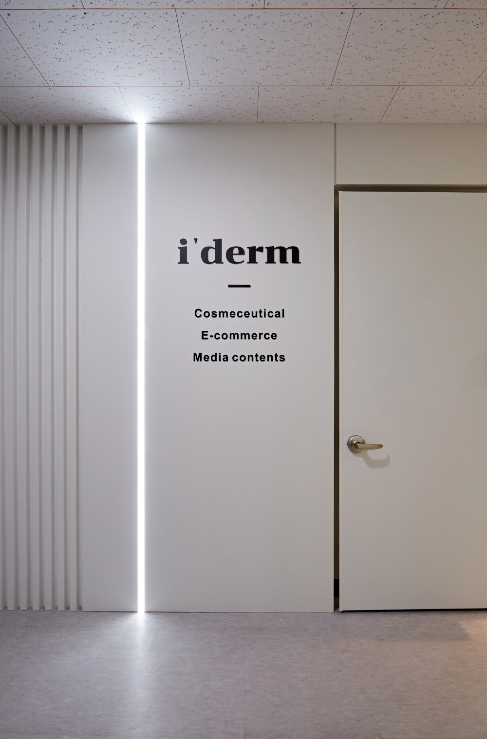내부로 들어가면, 아트월이 먼저 반겨줍니다. 아트월은 내부 공간이 바로 보이지 않고 사무실을 프라이빗하게 유지할 수 있게 하는 장치이기도 합니다. 그리고 회사의 로고를 정중앙에 배치하고 조명을 후면에 매립하여서 포인트를 주었습니다. 그리고 천장에는 다운라이트를 이용하여서 분위기를 만들어냈습니다.