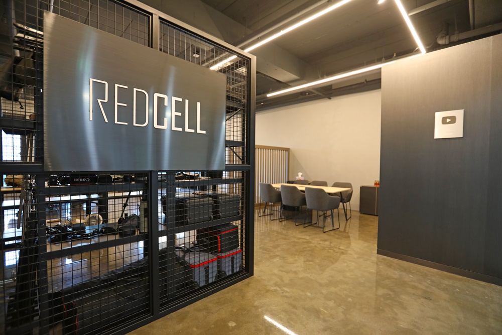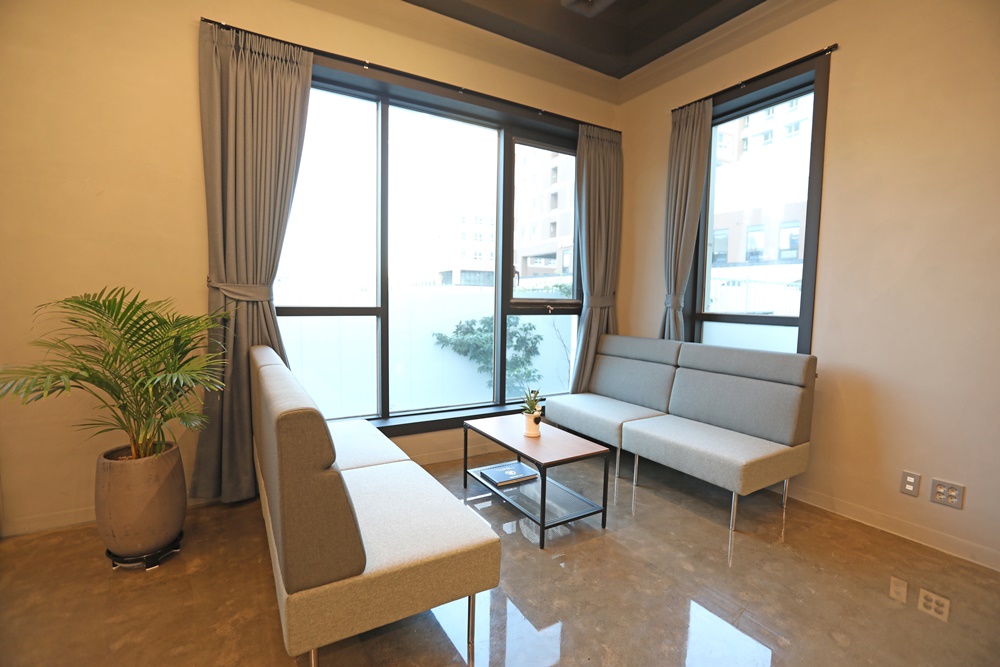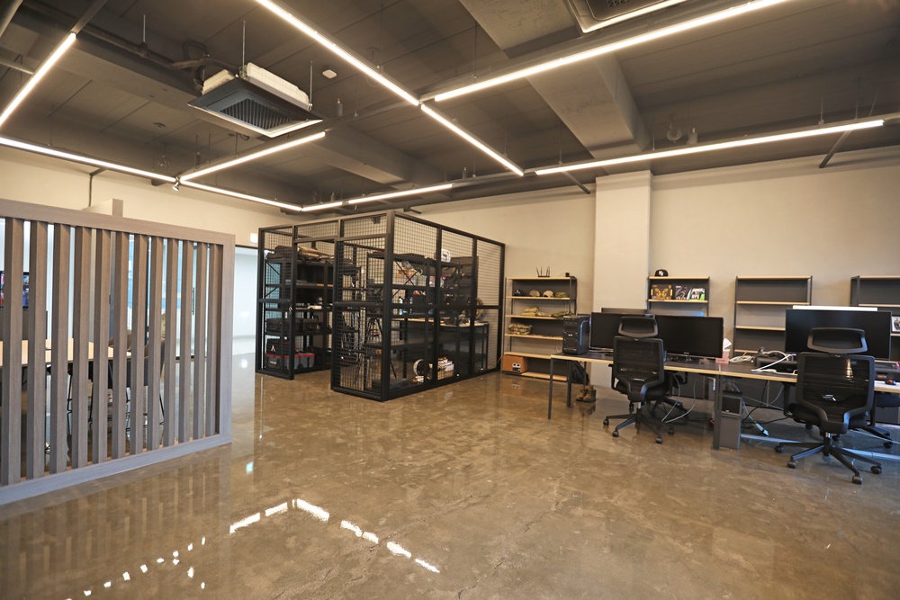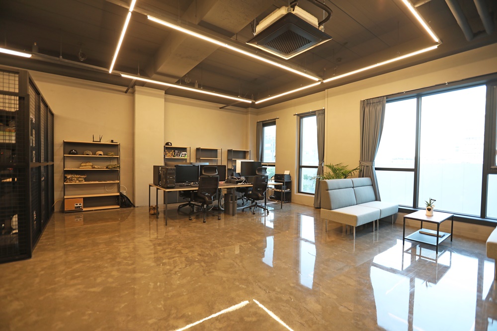 사무공간 모습입니다. 천장에는 조도가 가장 밝은 라인 형광등을 최대한 낮게 시공하고 영상 편집 작업이 이뤄지는 사무 공간을 햇빛이 드는 창가측으로 배치해 높은 층고의 단점인 조도를 보완했습니다. 창가에는 커튼을 시공해 햇빛이 너무 강하거나 더운 날에 조절할 수 있도록 해드렸습니다.