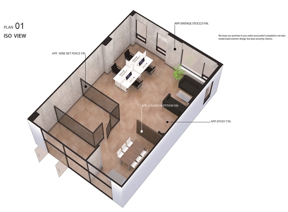 오픈형 사무실로 구성하되 가벽 대신 파티션, 금속망으로 공간을 구분하고 입구측에 회사 홍보, 실적 등을 전시할 수 있는 이미지월을 계획해 기업의 특성을 살렸습니다. 수납을 위한 공간은 금속망으로 펜스를 만들어 개방성을 확보했고 창가측에 사무 공간과 접대 공간을 계획해 업무의 효율성을 높였습니다. 탕비 공간은 입구 벽측에 계획해 직원들이 자유롭게 이용할 수 있도록 배려했습니다.