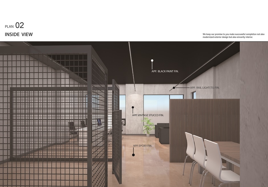 바닥은 에폭시로 마감하고 그레이톤의 벽면과 블랙 천장으로 마감했고 금속망과 파티션 역시 블랙과 그레이로 설치해 세련되고 모던한 느낌으로 연출되었습니다. 특히, 깔끔한 블랙 금속망 펜스로 만든 수납실에 블랙 스텐 간판까지 부착하니 강인한 카리스마가 철철 넘쳐 나네요.