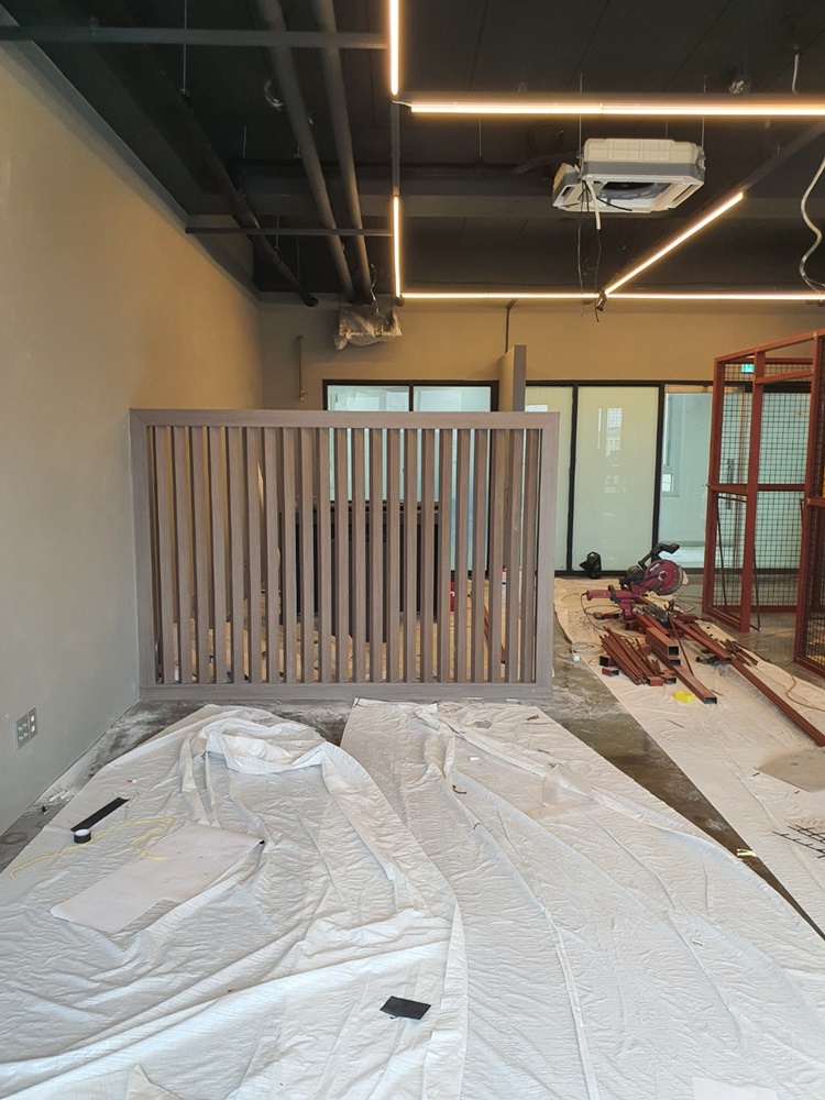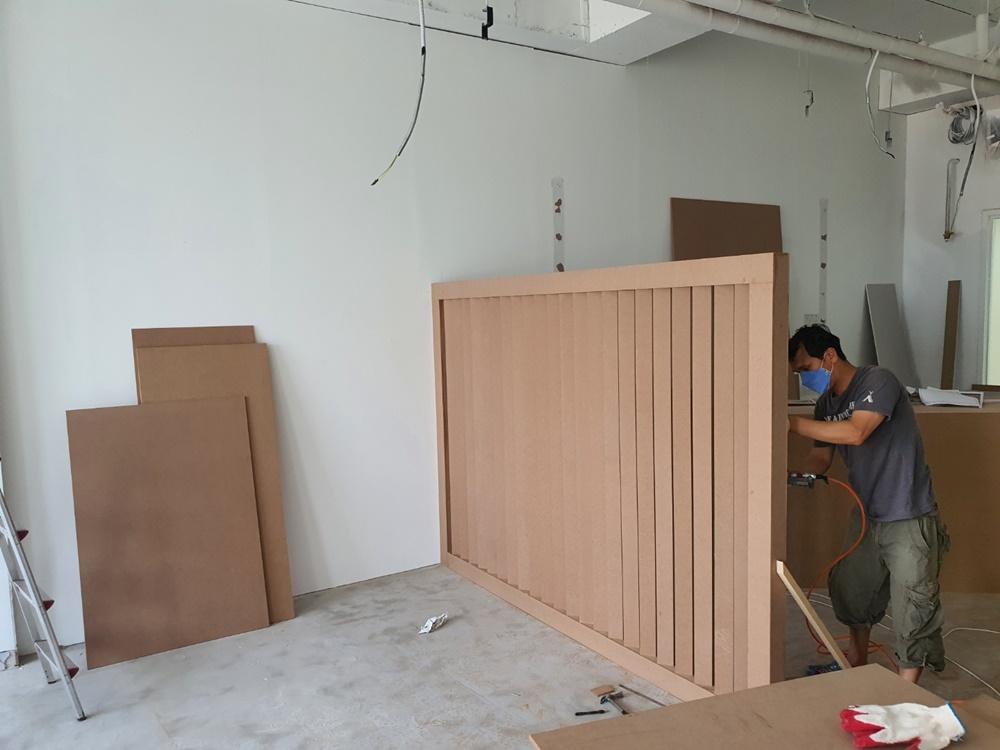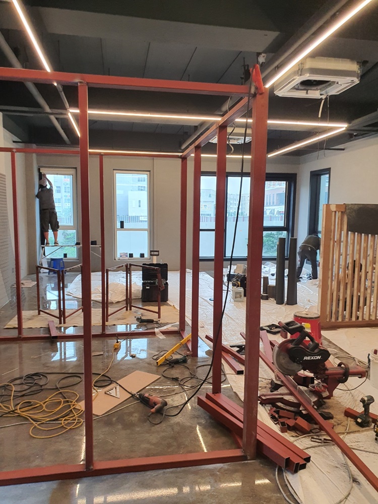 철거작업 및 천장 기본 작업 후에는 목공 작업에 돌입하게 되죠. 목공 작업은 레이아웃을 나누는 구조 작업과 장식을 하는 치장 작업이 있는데 이번 현장은 가벽을 세우는 대신 간살 프레임과 금속망을 세우기로 해 크게 구조작업을 하지는 않았습니다.