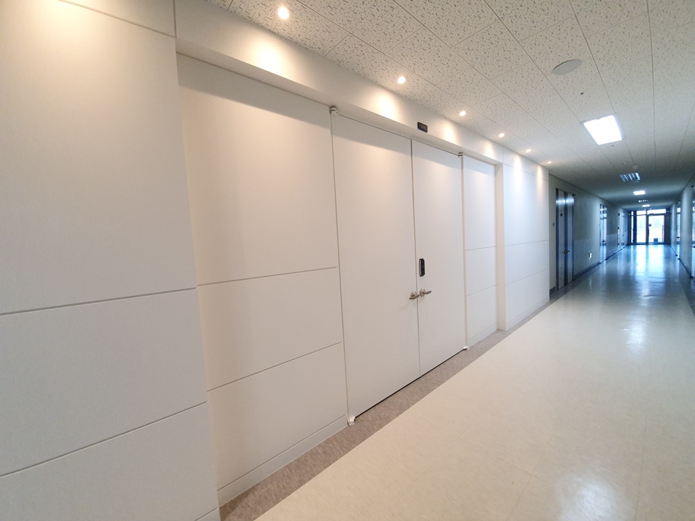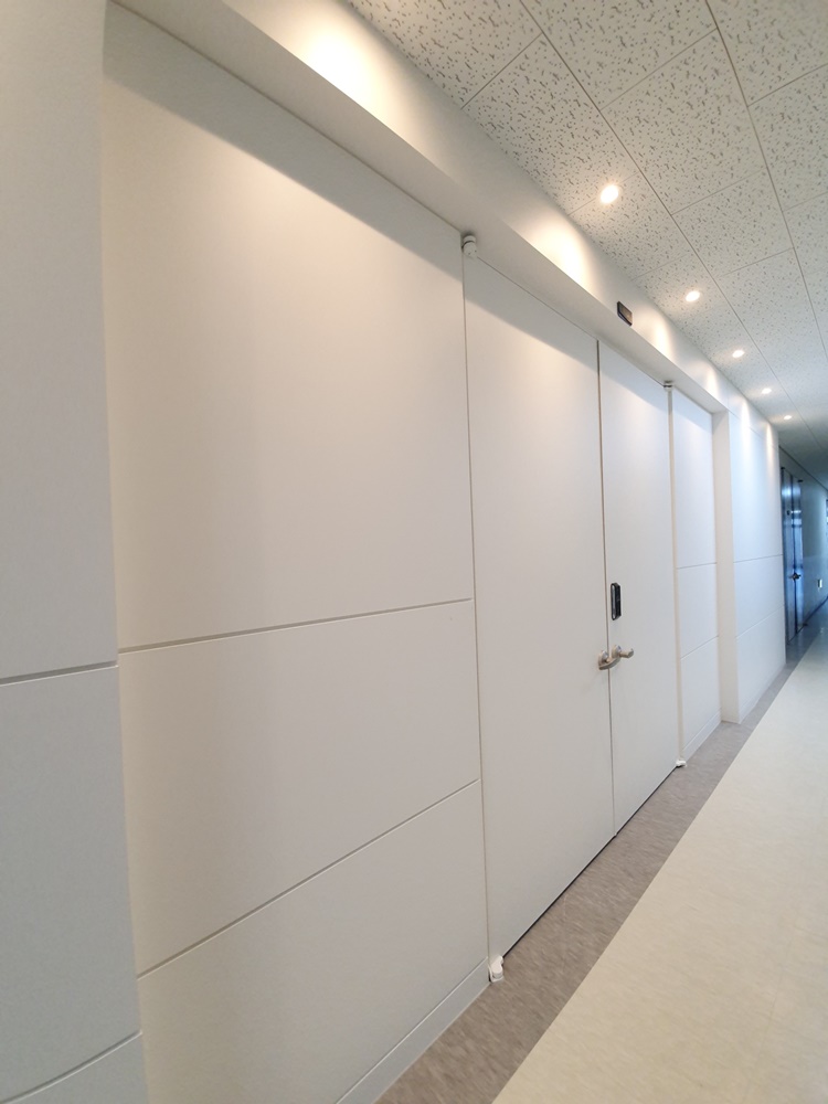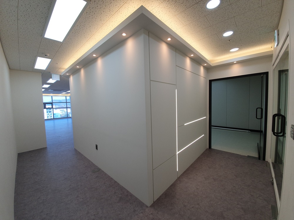 복도 공간입니다. ㄱ자 형태로 진입하는 내부를 인테리어적 요소로 활용해 이미지월로 활용했는데요, 알판 작업으로 디자인을 만들고 단차를 줘 사이에 간접 조명을 시공해 세련된 이미지월을 완성했습니다.