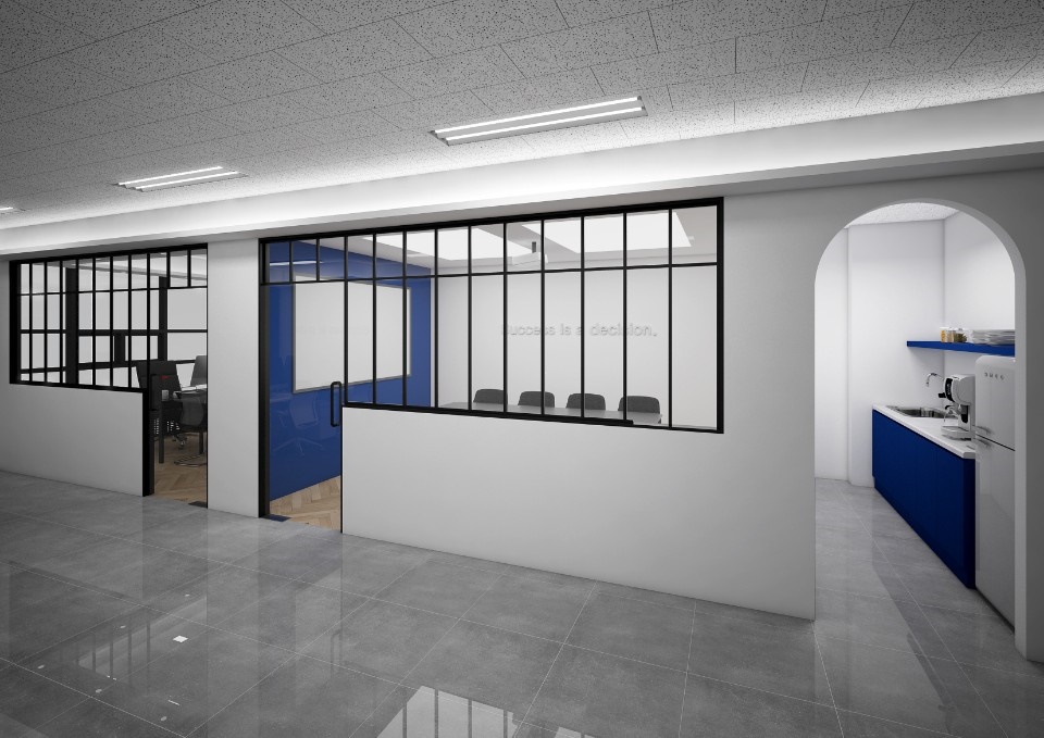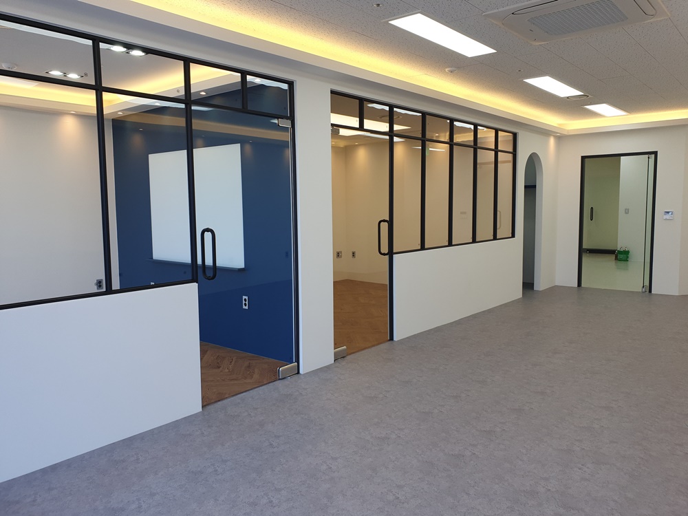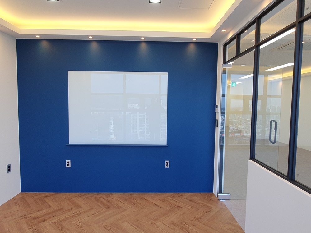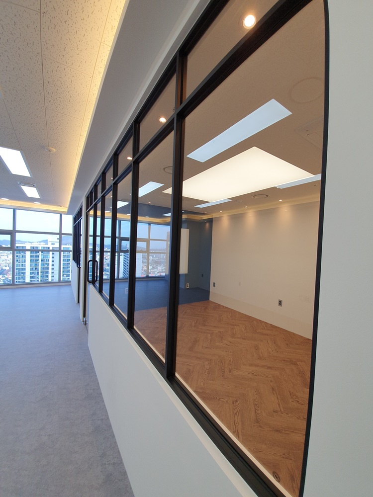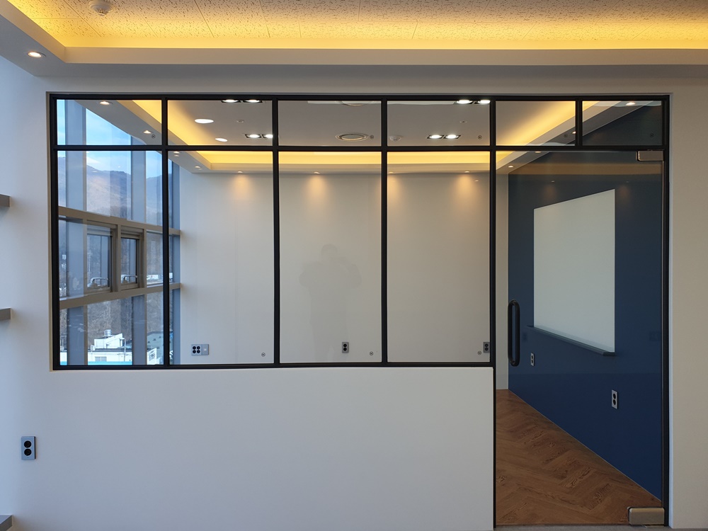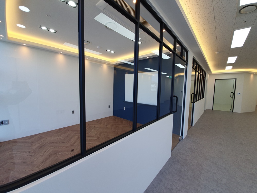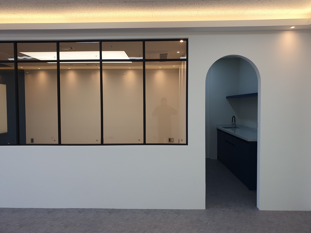 대표실과 회의실은 유리창을 적용한 가벽으로 분리했는데요, 이 모습이 얼마나 똑같이 시공됐을지 현장 시공 및 완공 사진으로 확인해 보겠습니다.