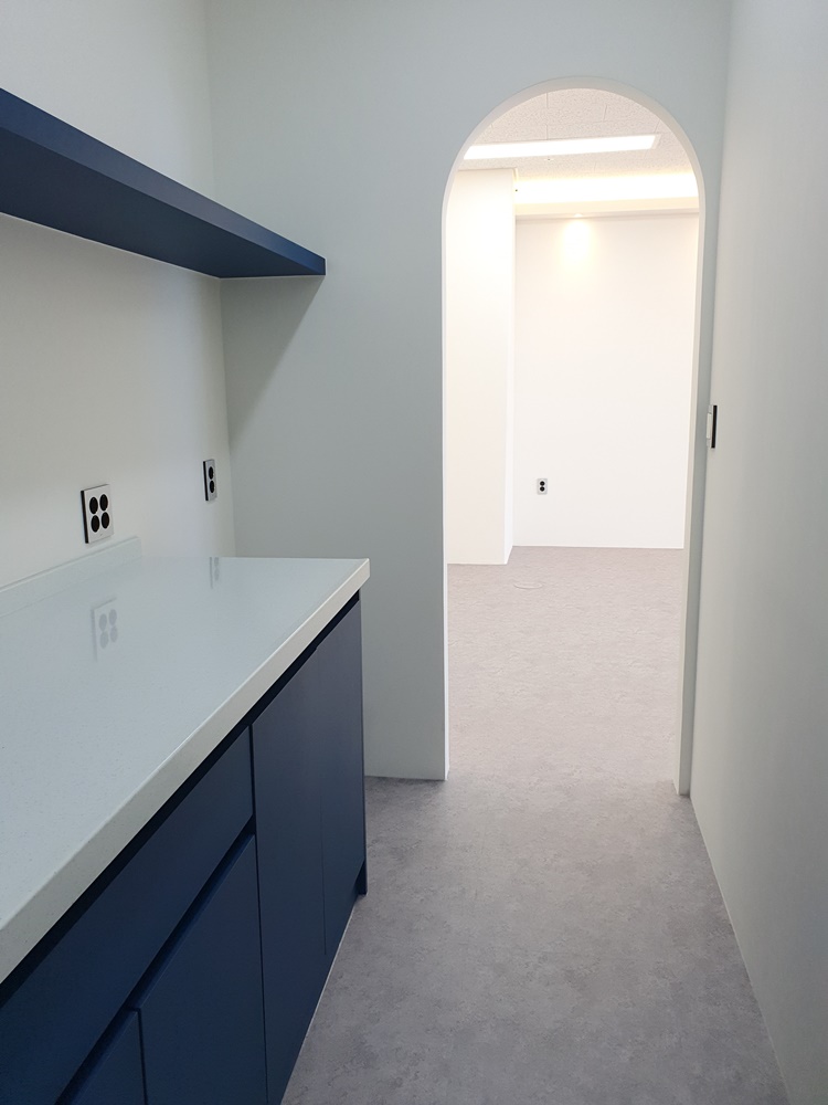 최근 유행하고 있는 아치형 출입구로 계획된 탕비실입니다. 수납을 위해 하부장을 시공하고 상부는 요즘 트랜드에 맞게 선반으로 대체해 공간을 좀 더 넓고 세련돼 보이게 해드렸습니다. 가산 에이스골드타워 회사 사무실 인테리어 비용을 알아보고 계시다면 저희 916디자인으로 문의해 주세요. 대표실을 비롯한 각 공간분리를 효율적으로! 하는 최적의 레이아웃을 제안드리고 합리적인 견적으로 시공은 진행해 드리겠습니다.