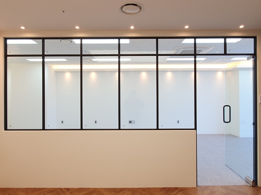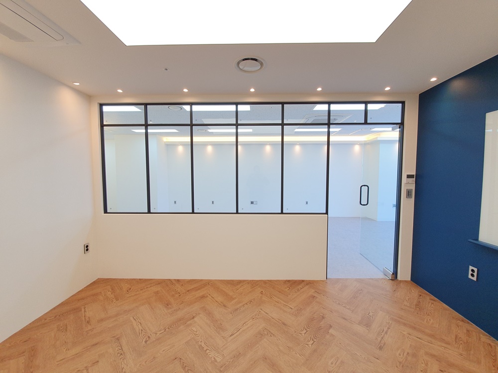 사무 공간은 오픈형으로 시공하고 대표실과 회의실은 공간을 구분해 독립형으로 시공했는데요, 고객님께서 답답하지 않고 너무 노출되지 않는 가벽을 원하셔 유리, 프레임, 합판으로 디자인한 가벽으로 대표실 공간분리를 효율적으로! 해드렸습니다.