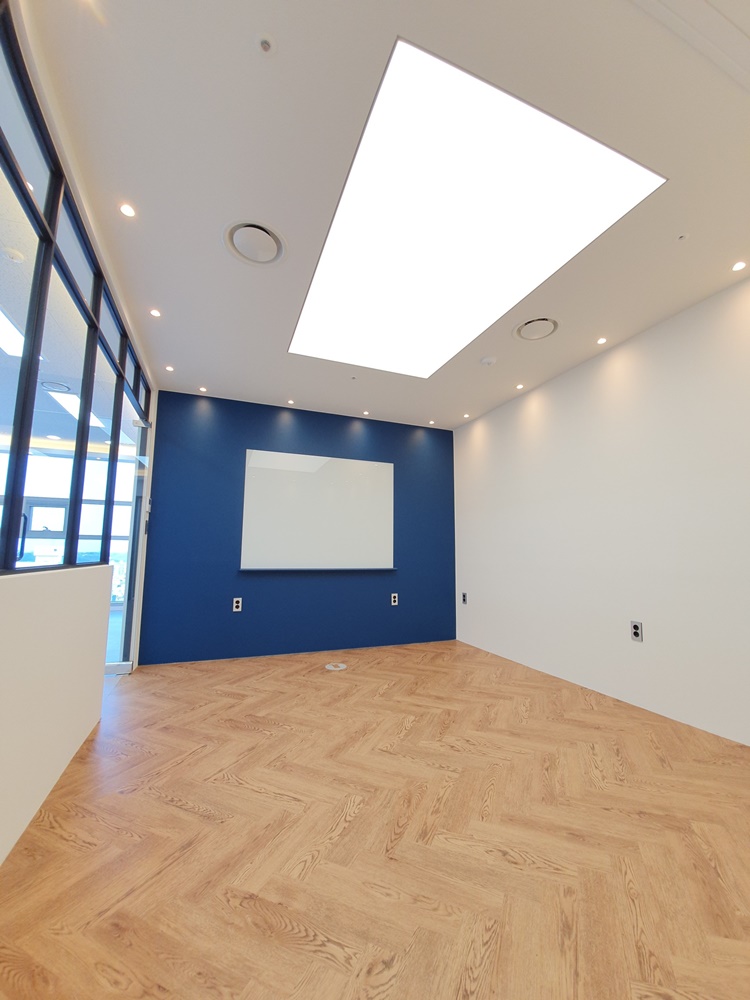 특히, 코너부 실은 외부에 모서리가 생기기 때문에 디자인으로 활용을 잘 해야 하는데요, 이번 현장은 회사 로고를 디자인적 요소로 활용해 모서리 부분에 입체감 있게 계획해 심플하면서도 강렬한 디자인을 구현했습니다.