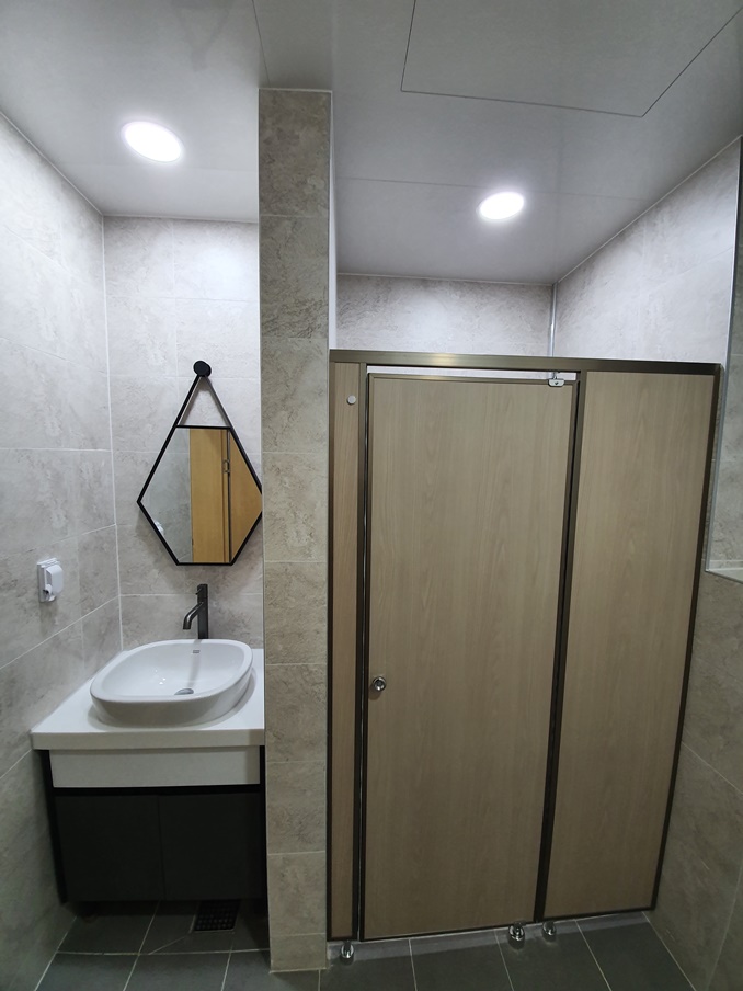 유지관리가 편리한 타일과 밝은 조명으로 시공한 화장실입니다. 가산 에이스 가산 포휴지식산업센터 사무실인테리어, 깔끔한 디자인 추천!을 원하신다면 저희 916디자인으로 문의해 주세요. 다양한 업종의 수많은 시공을 통해 축적한 경험과 노하우를 바탕으로 합리적인 견적과 퀄리티 높은 시공을 진행해드리겠습니다.