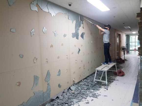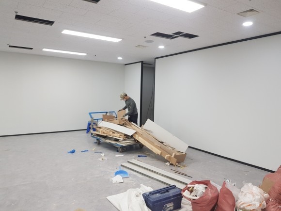 사무실 인테리어의 첫 공정은 철거 후 목공 작업입니다. 기존의 벽면을 철거하고 천장 배선, 공조시스템, 배관, 소방시설 등을 점검한 후 목공 작업을 진행하는데요, 철거 후 폐기물은 절차에 맞게 처리를 진행해야 하기 때문에 전문 업체에 맡겨야 폐기물, 박힌 못 등을 깔끔하게 정리할 수 있습니다.