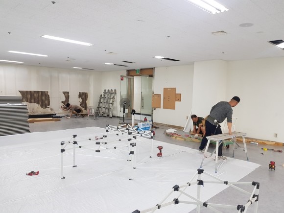 입구 파사드 공사 역시 철거-목공-마감 작업을 진행해 시공을 합니다. 기존 구조물을 철거하고 최종 시안을 적용하기 위해 밑그림인 알판 작업으로 틀을 만들고 단차를 만드는 등의 작업을 완료한 후 깔끔한 도장을 위해 틈을 메우는 퍼티 및 평평하게 가는 샌드 작업을 해줍니다.
