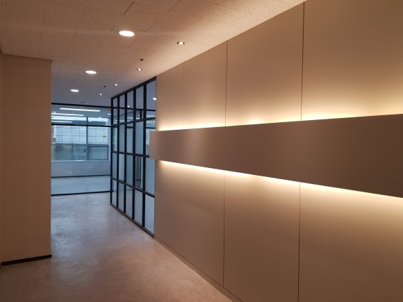 조명 시공 작업까지 끝내니 어느 정도 사무실의 모양이 갖춰지고 있네요. 조명은 사무실의 업무 효율과 상관있는 조도를 결정짓는 중요한 요소이기 때문에 레이아웃과 책상, 책장, 진열장 등의 가구 배치에 맞춰 시공을 해야하기 때문에 시공 전 디자인설계를 할 때 정확하게 구성하는 것이 중요합니다.