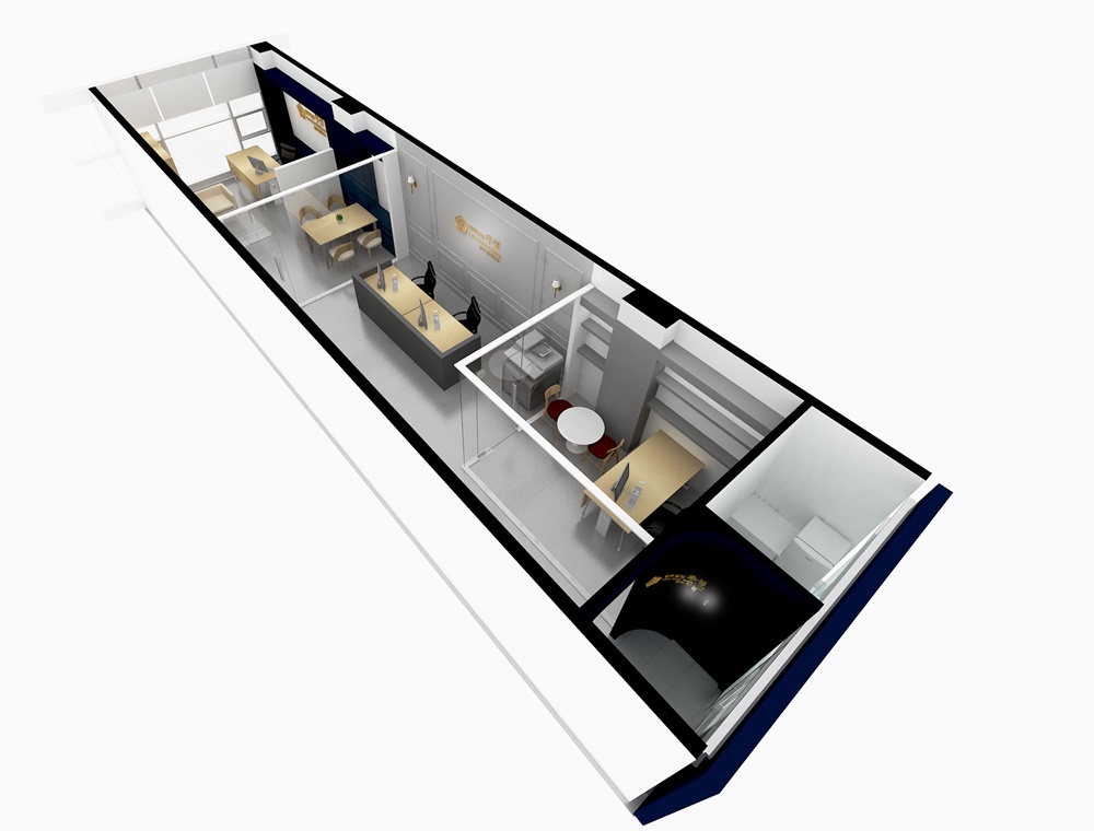 내부 파사드 3D 이미지입니다. 내부로 바로 연결되는 출입문이 있는 가벽을 세우고 시그니처 컬러인 딥블루 계열로 마감하고 회사명과 로고를 계획해 이미지월로 활용할 수 있도록 디자인에 반영했습니다.