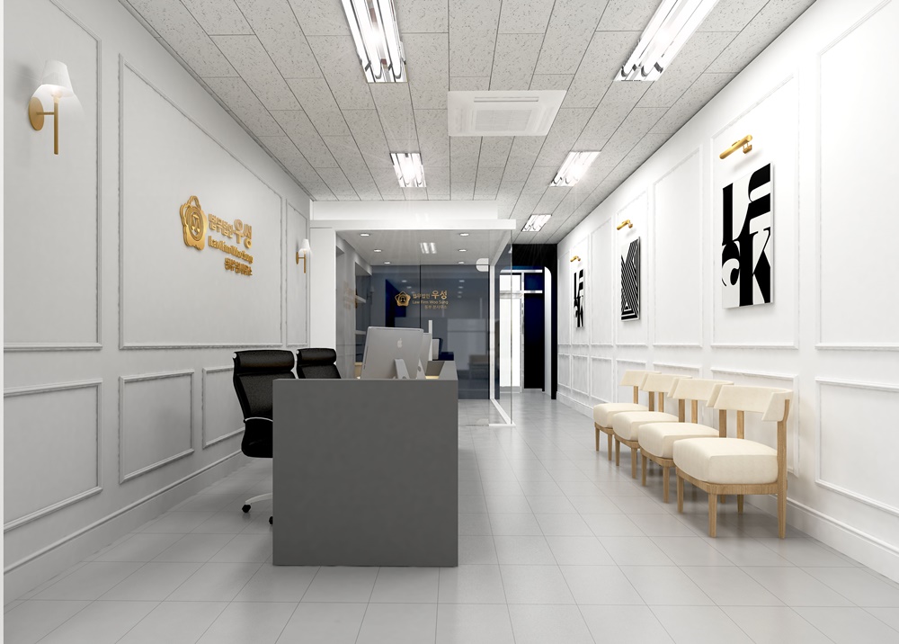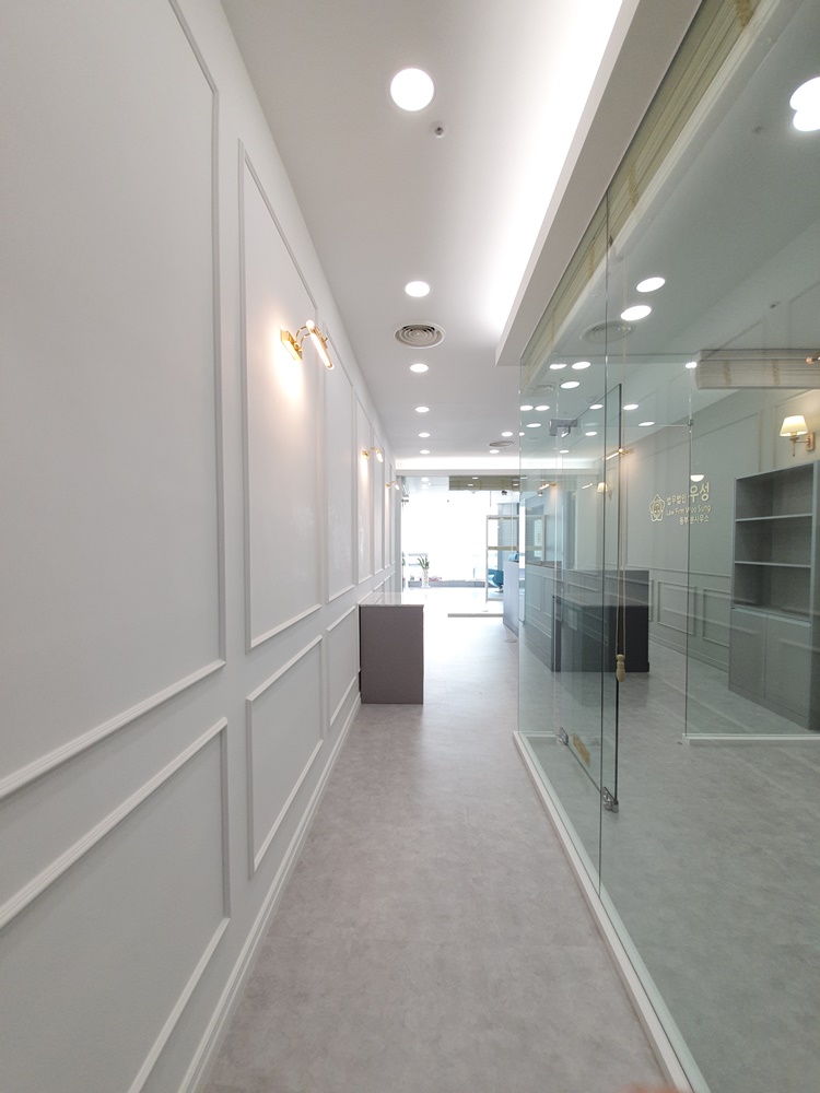 오늘 보여드리는 사례를 가산 테라타워 변호사 사무실인테리어 추천하는 이유는 좁은 사무실이면서 입구 파사드가 글래스로 돼있는 조건일 경우 어떻게 인테리어를 하면 좋을지에 대해 알 수 있기 때문입니다. 일반 벽면이 아닌 글래스 벽면에는 알판 작업을 통해 디자인을 만들고 치장을 해줘야 합니다.