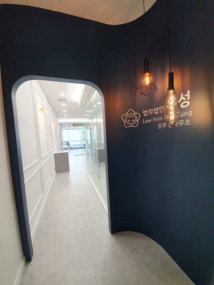 오픈형 라운드 아트월이 적용된 로비 공간입니다. 좁은 사무실이긴 하지만 내부를 가리면서 효율적인 공간 분리를 할 수 있는 가벽으로 시공하고 벽면에 회사명과 로고를 시트지로 시공한 후 팬던트형 조명으로 강조함으로써 가독성을 높였습니다. 독특한 조명 연출은 변호사 사무실인테리어로 추천드리는 인테리어법인데요,