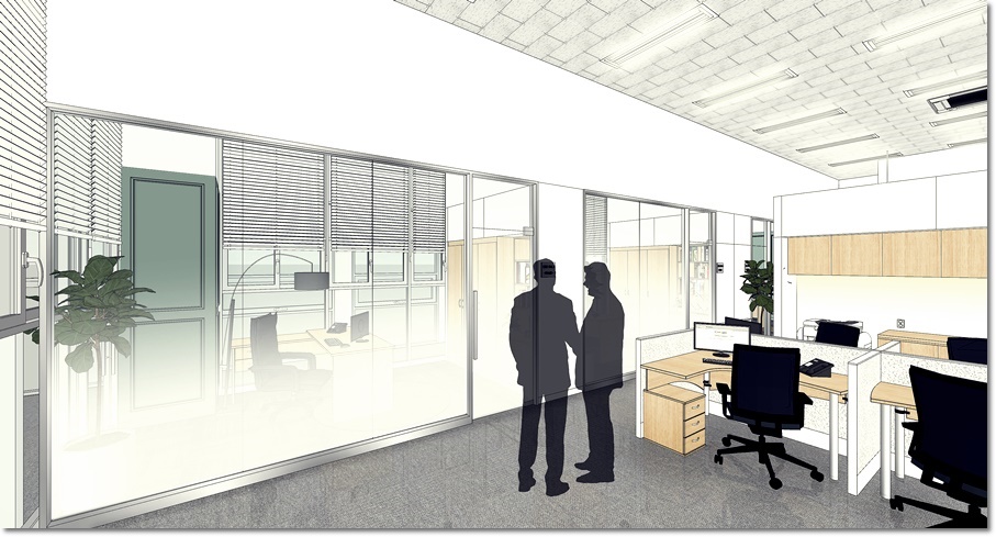 가산 skv1 AP타워 사무실인테리어, 50평 60평 회사 3D 디자인 설계를 할 때 유리 가벽을 적용하는 것이 너무 직접적인 노출이 부담스럽다면 불투명 시트지를 부분적으로 시공하면 프라이버시를 확보하면서 독립적으로 사용할 수 있습니다.