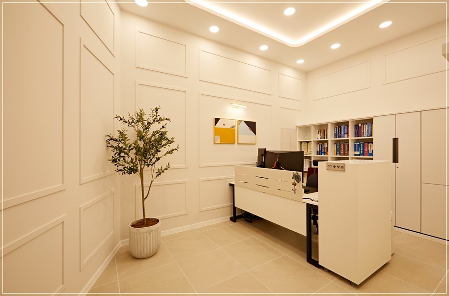 대표실은 합판 가벽으로 시공해 완벽하게 분리했고 아치형 문틀에 슬라이딩 도어를 시공해 부드러운 이미지를 부여했습니다. 내부 인테리어는 전체적으로 화이트로 마감하고 우물천장으로 시공해 통일성을 주면서 벽면에 웨인스코팅을 시공해 공간의 차별성을 두었습니다. 웨인스코팅은 형태, 두께, 시공방식 등에 따라 다양한 분위기를 조성할 수 있는 장식용 몰딩으로 공간에 구애받지않고 적용할 수 있어 주거공간, 사무공간, 상업공간 등에 많이 시공되고 있습니다.