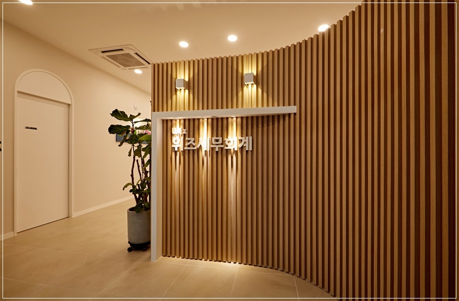 내부 로비입니다. 우드 간살로 마감된 곡선형의 아트월을 세워 내부로의 동선과 외부 시선을 차단하고 방문객의 동선을 유도했습니다. 또한, 내부도 들어오는 파사드에 해당하는 면에 로고와 업체명을 시공하고 서포트 조명으로 강조해 포인트를 줌으로써 인지성과 가독성을 높일 수 있었답니다.