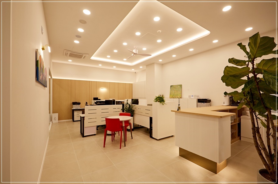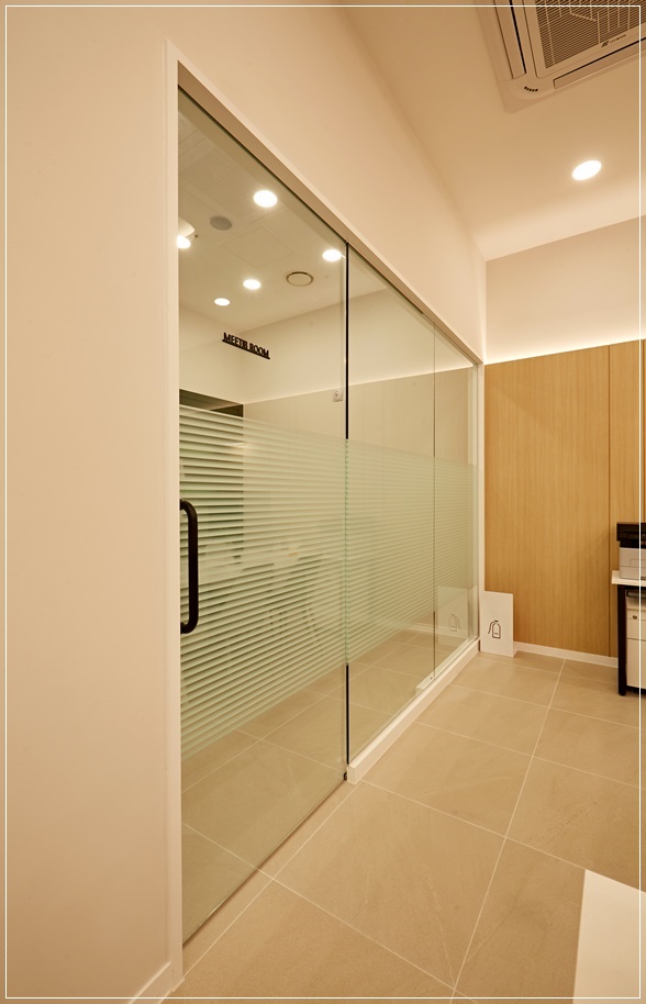 외부 파사드는 유리와 프레임을 활용해 내부를 볼 수 있도록 함으로써 홍보와 마케팅의 수단으로 활용했습니다. 다만, 내부 직원들의 모습을 직접적으로 노출하지 않기 위해 아트월을 시공했고 이를 외부 파사드로 차용했는데요, 화이트 & 우드로 시공된 외부 익스테리어와 내부 아트월의 우드 간살이 잘 어우러지면서 고급스러운 분위기를 조성하고 있습니다.