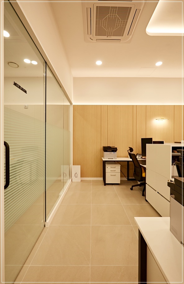 내부 공용사무실입니다. 전체적으로 화이트로 마감하고 베이지 바닥과 우드 수납장을 시공해 따뜻한 느낌을 주었는데요, 천장은 우물형으로 시공해 층고를 확보함으로써 고급스러운 무드를 조성할 수 있었습니다. 조명은 깔끔한 매립형으로 시공하고 우물천장엔 간접조명을 심어 충분한 조도를 확보할 수 있어 화사하고 쾌적한 분위기에서 업무를 진행할 수 있습니다.