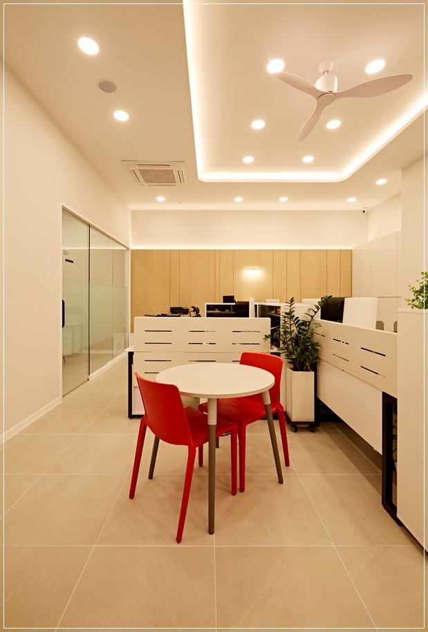전체적으로 화이트로 마감을 하고 연한 우드를 적용해 밝고 화사하면서 따뜻한 느낌이 드는 모던 스타일의 사무실로 직원들이 근무하는 사무실은 통합형으로 계획하고 한 켠에 싱크태와 홈바를 갖춘 탕비실 및 휴게공간을 함께 구성했답니다. 탕비실 공간은 직원들이 휴식을 취할 수도 있고 자유로운 업무 진행을 할 수 있는 곳으로 계획해 자유로운 분위기에서 근무 능률을 올릴 수 있도록 배려습니다.