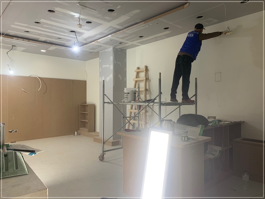 고객님과 끊임없는 소통을 하며 3D 이미지를 통해 디테일한 수정을 거친 후 최종시안을 확정하면 이를 토대로 본격적인 공사를 시작합니다. 설계도면과 3D 이미지를 바탕으로 효율적인 시공을 하기 위해 공사 전 배선, 배관, 공조, 소방 등의 시설을 점검하고 정리한 다음 목공 작업을 시작했습니다.