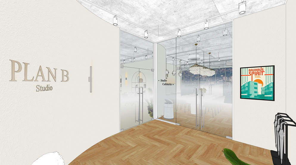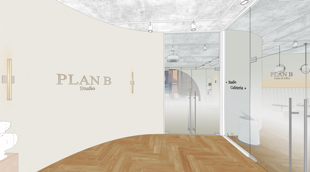 오늘 소개해드릴 디자인은 촬영 스튜디오를 운영하는 업체를 위해 제안드렸던 시안입니다. 스튜디오로 진입하는 출입문과 사무실로 진입하는 출입문을 따로 계획해 방문 목적에 따른 동선을 명확하게 구분했습니다. 단, 로비 공간에서는 서로 출입할 수 있는 중문을 시공해 편리성을 높였는데요, 이 때 나무 벽이 아닌 유리 가벽을 적용해 개방감과 확장감을 확보하도록 했습니다.