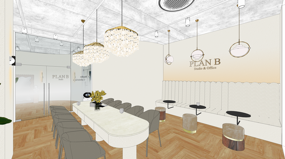 다만, 방문객의 출입을 빨리 알지 못할 수 있으므로 외부 입구에 인터폰을 설치하거나 예약제를 시행한다면 좀 더 유용하게 활용할 수 있습니다. 방문객 응대뿐 아니라 스튜디오 방문객의 대기 및 직원들의 휴식이 이뤄질 수 있는 공간이기 때문에 스튜디오와 사무실의 중간에 계획해 제안을 드렸답니다.