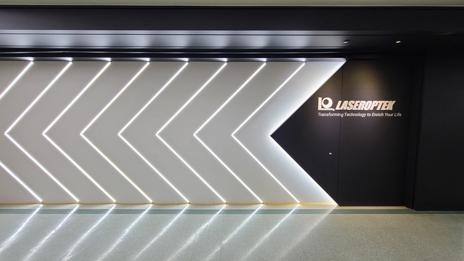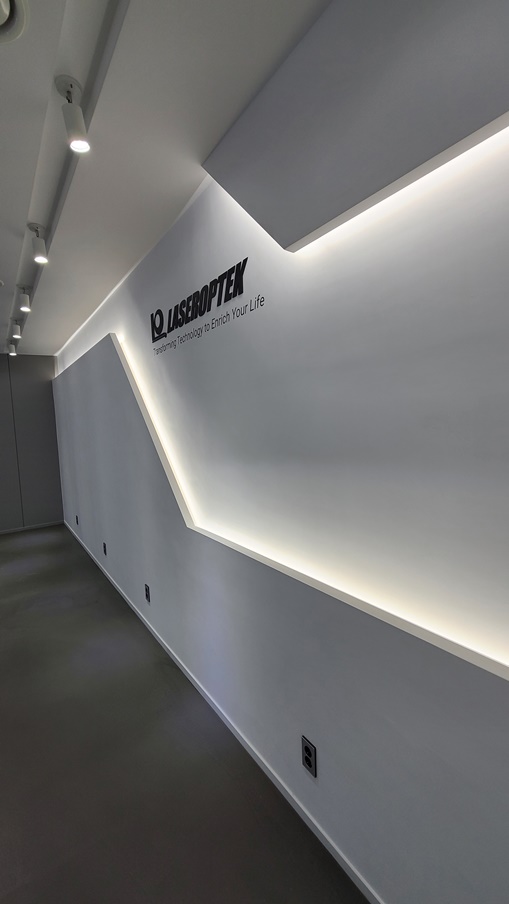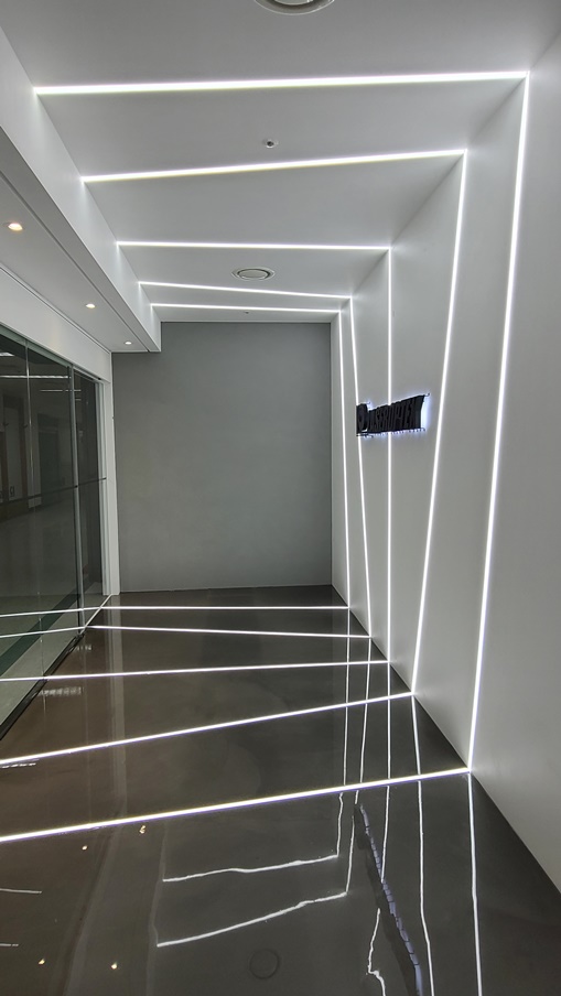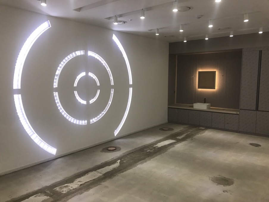 홍보 및 전시를 할 수 있는 쇼룸입니다. 화이트 벽면과 그레이 바닥의 대비로 깔끔함을 강조했고 양 벽면에 멋진 디자인 덕분에 첨단의 미래지향적인 느낌이 강한 공간입니다. 천장에 레일 조명을 시공해 위치와 각도를 조절할 수 있도록 함으로써 쇼룸을 다양하게 활용할 수 있도록 했습니다.
