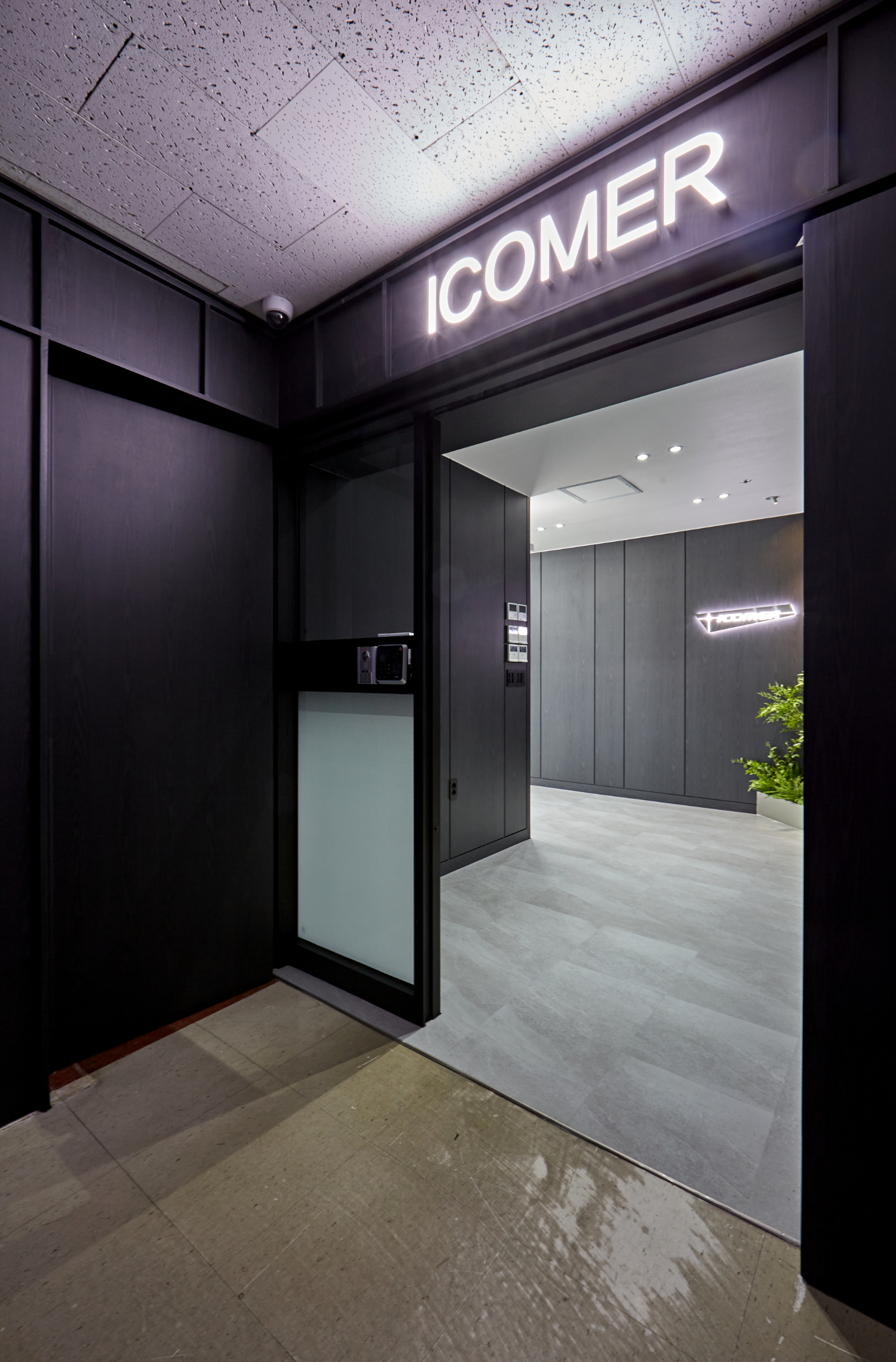 들어서자마자 광활하게 보이는 공간은 모든 직원이 공용으로 쓰는 공간이자 사무실이 될 예정인데요. 붓터치 질감이 느껴지기도 하는 그레이색 바닥 소재와 천장은 대형 우물형으로만들어 곳곳에 간접 조명을 배치하였습니다. 그리고 LED조명을 적절히 혼합하여서 밝은 시야를 유지하고, 전체 통창으로 채광을 높였습니다.