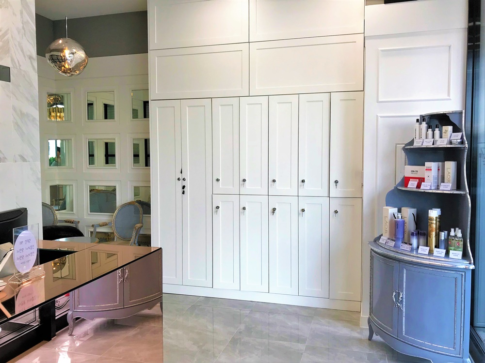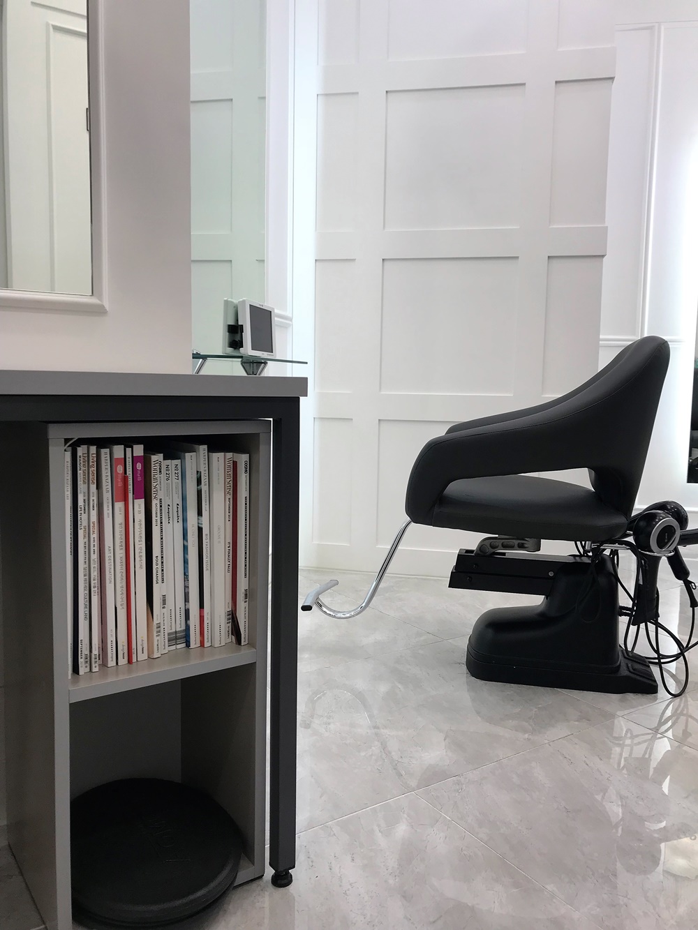 거울 앞에 수납공간이 있는 의자를 배치하면 고객이 이용 중에도 편리함을 느낄 수 있죠.