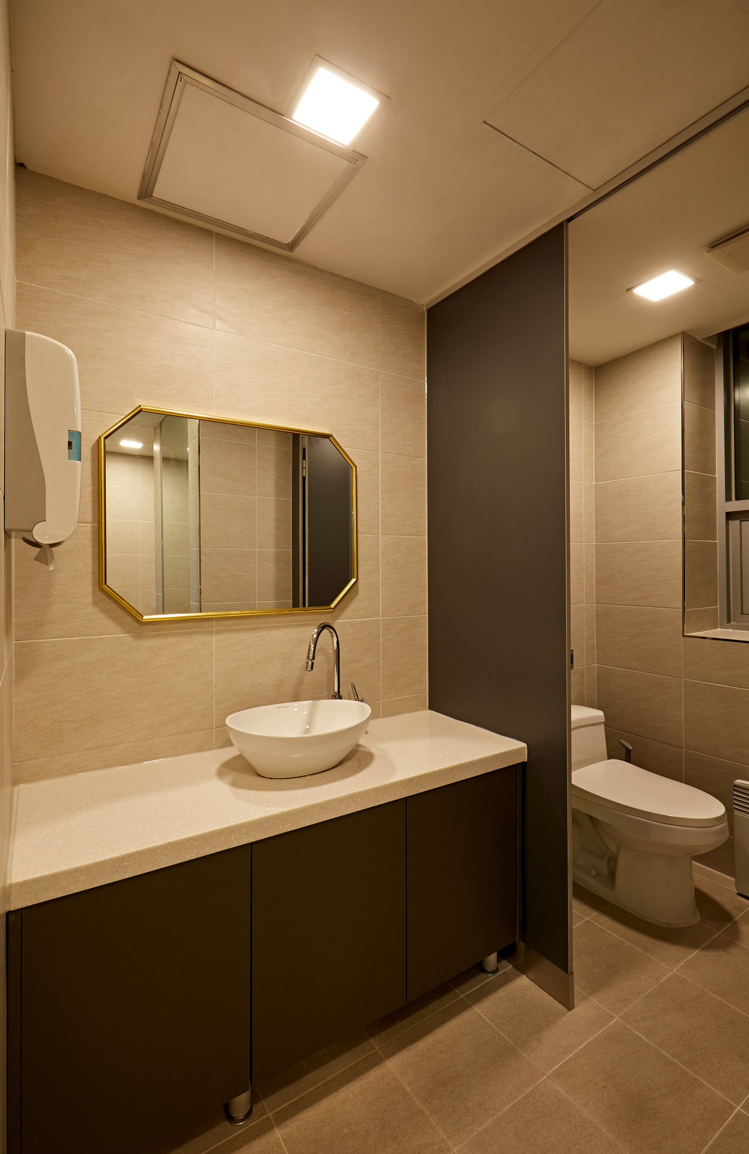 화장실 역시 사무실과 동일한 우드 색상과 조명을 사용하여 전체적인 밸런스를 맞췄습니다. 또한 골드프레임의 악세서리들과 거울 프레임으로 전체적인 컨셉과 통일감을 맞추었습니다