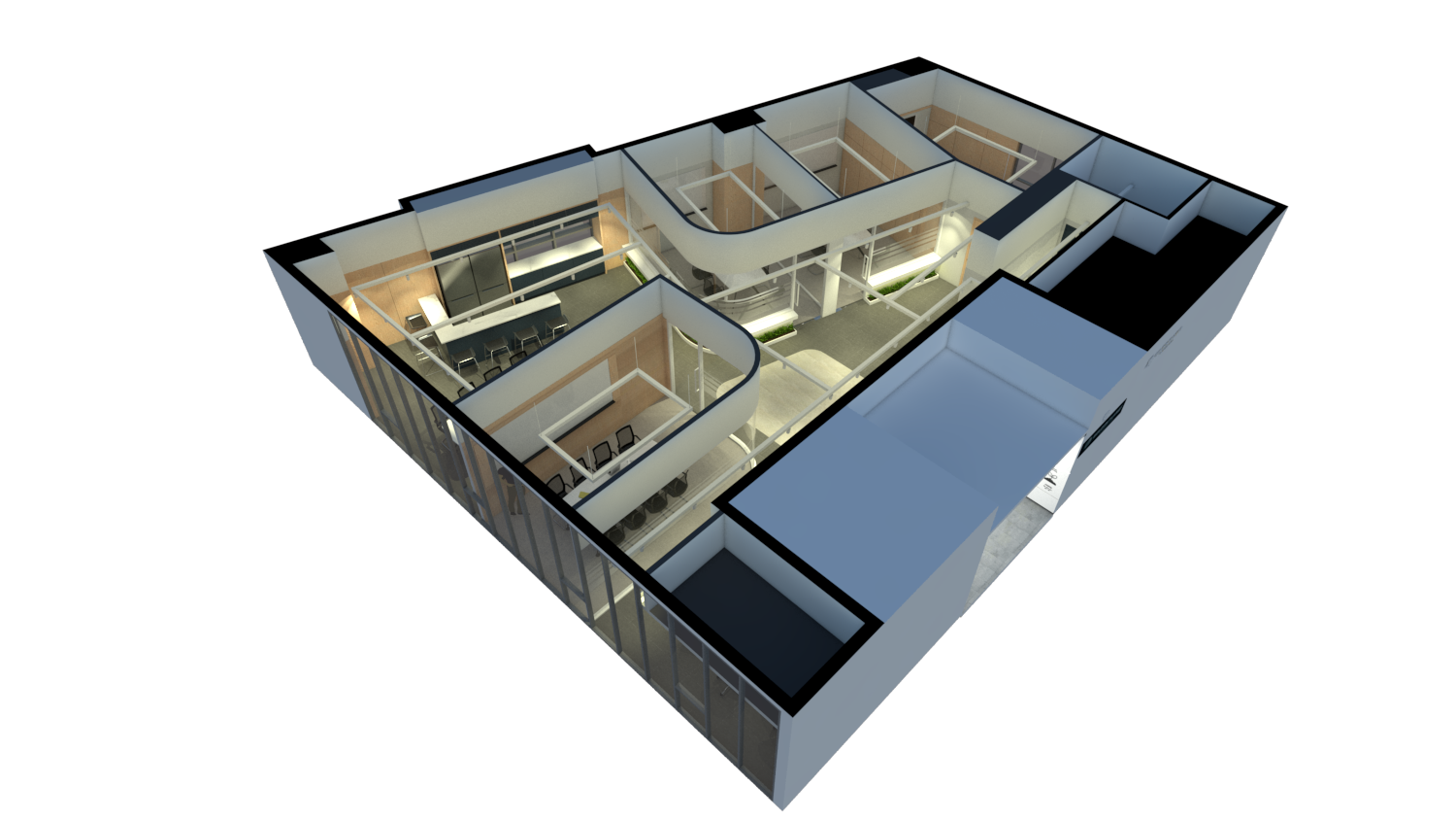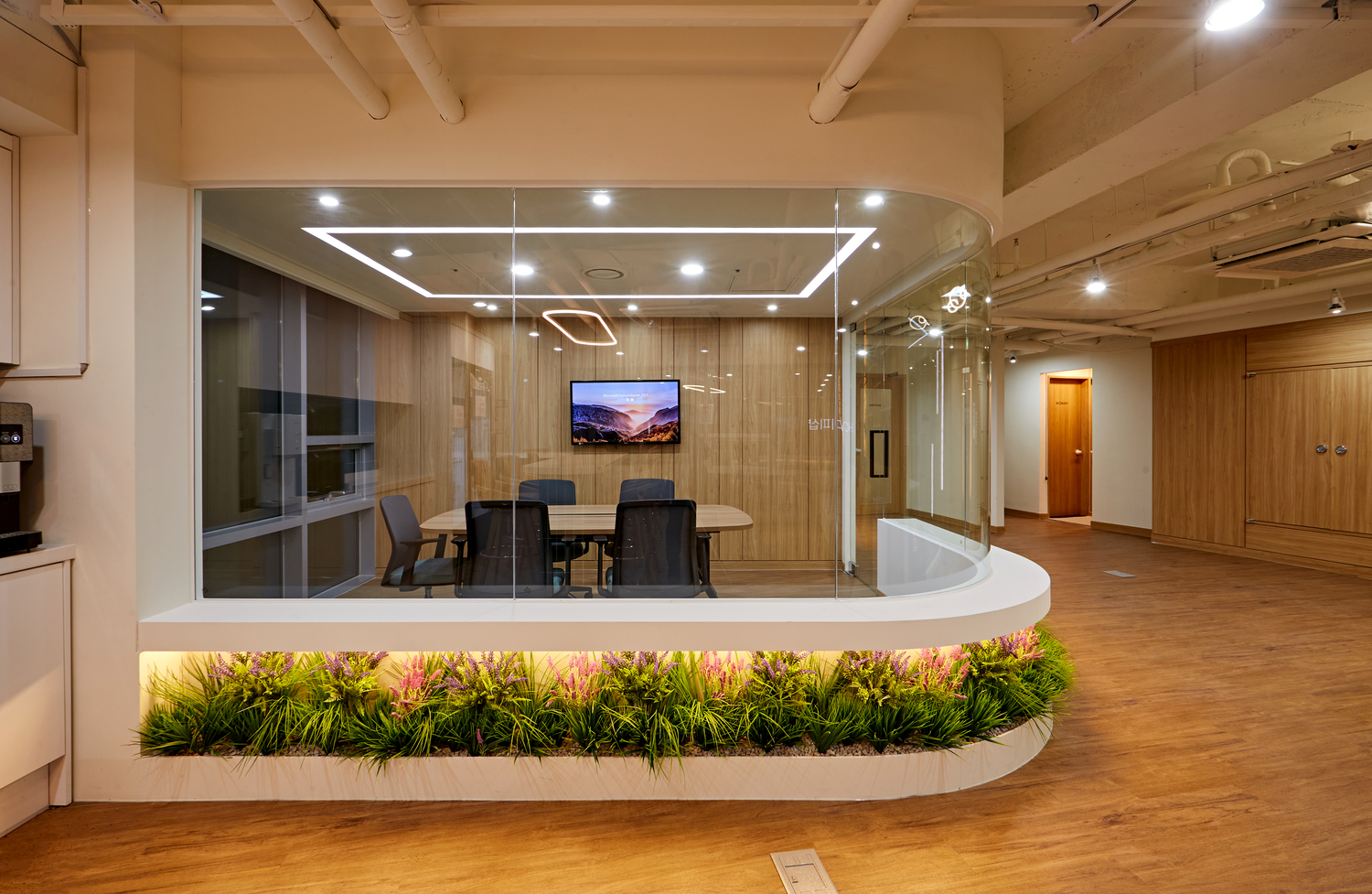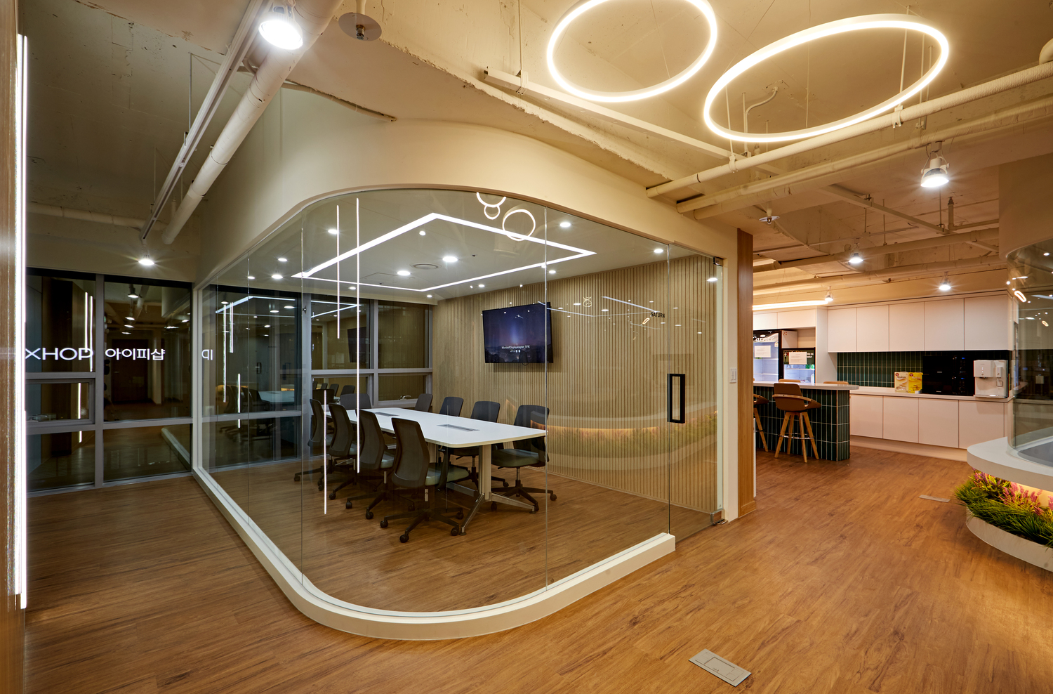 또한 메인 공간에 위치한 회의실은 벽면을 라운드 타입으로 설계하여 전체적으로 부드러운 이미지를 주고 있습니다.