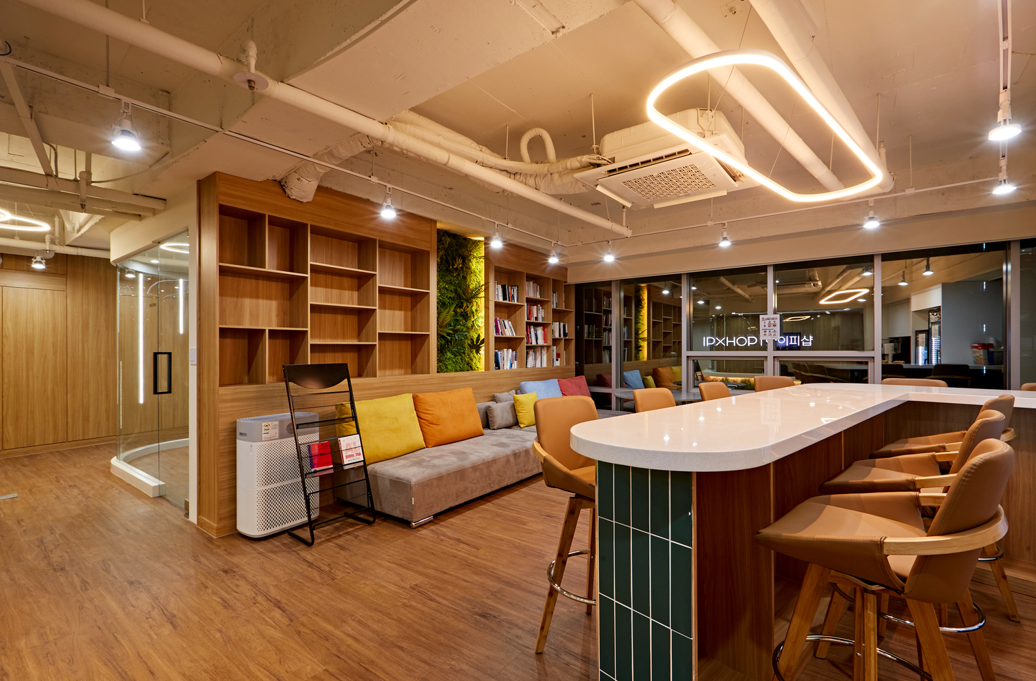 직원들이 언제나 편안하게 이용할 수 있도록 아일랜드 바 하단은 그린 컬러의 타일, 쇼파 쿠션 컬러에 다양한 색감을 넣어 자유로운 분위기를 연출 하였습니다. 또한 좌석의 형태로 여러가지기에 취향에 따라 휴식을 취할 수 있으며 간단하게 식사를 하거나 혹은 뒷편의 책을 읽으며 잠깐의 휴식으로 업무의 효율성을 높이고 복지를 향상시킬 수 있습니다.