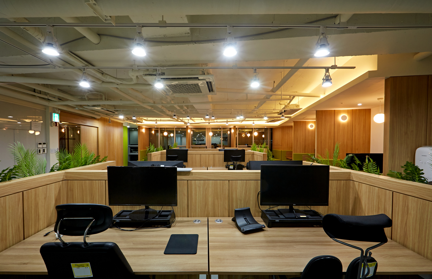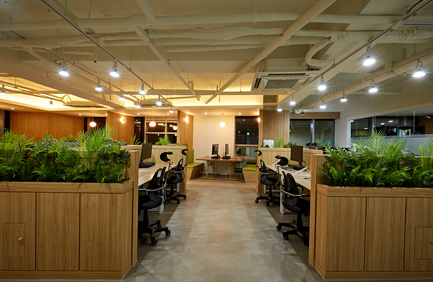 다음은 강남사무실 업무 공간입니다. 디자인 회사인만큼 창의력을 올려줄 수 있는 환경을 만들었는데요.파티션 높이를 낮춰 개인적인 업무 공간을 만들면서 직원들끼리 원활하게 소통을 할 수 있게 했습니다. 또한 눈높이에 걸리는 것이 없다보니 더욱 넓어보이는 효과가 있었으며 자리마다 플랜테리어를 함께 조성하여 어둡고 딱딱한 분위기가 아니라 자율적인 회사라는 이미지에 대한 강점을 시각적으로 표현했다고 볼 수 있습니다.