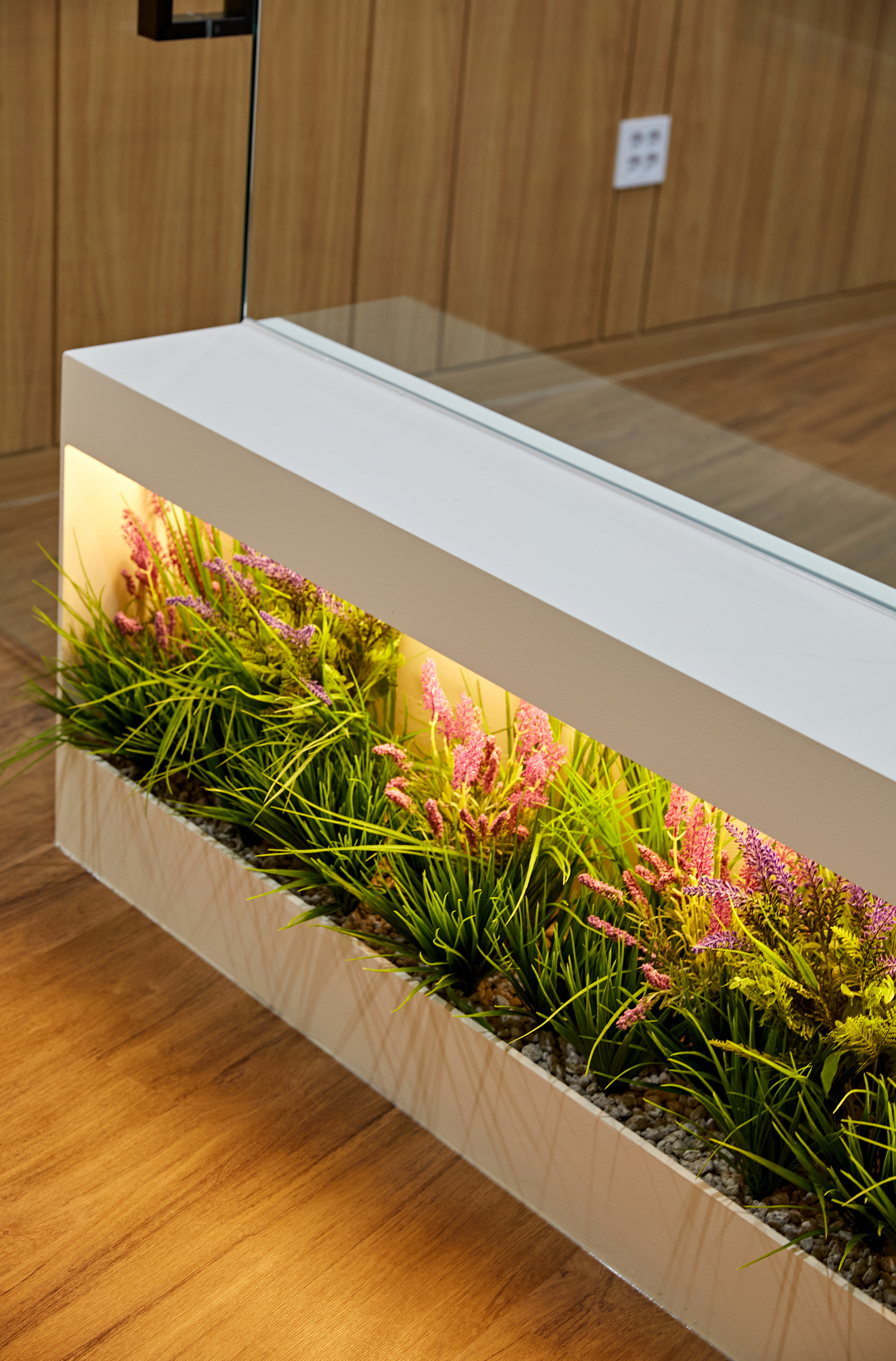 벽면 하단에는 플랜트 인테리어에 간접등을 넣어 따뜻한 감성으로 포인트를 주었습니다.실제로 벽면과 바닥에 사용된 우드 컬러는 조도가 높은 편은 아니지만 조명의 효과로 어둡지 않고 밝고 따뜻한 느낌입니다.