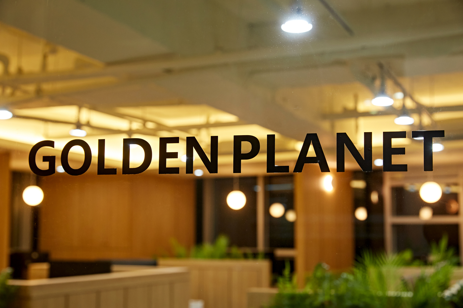 지금부터 골드 플래닛 현장의 공간별 3D 디자인을 확인해보겠습니다.화이트 & 우드 파사드의 입구는 깔끔하게 기업 로고와 간단한 회사 소개를 넣었습니다.