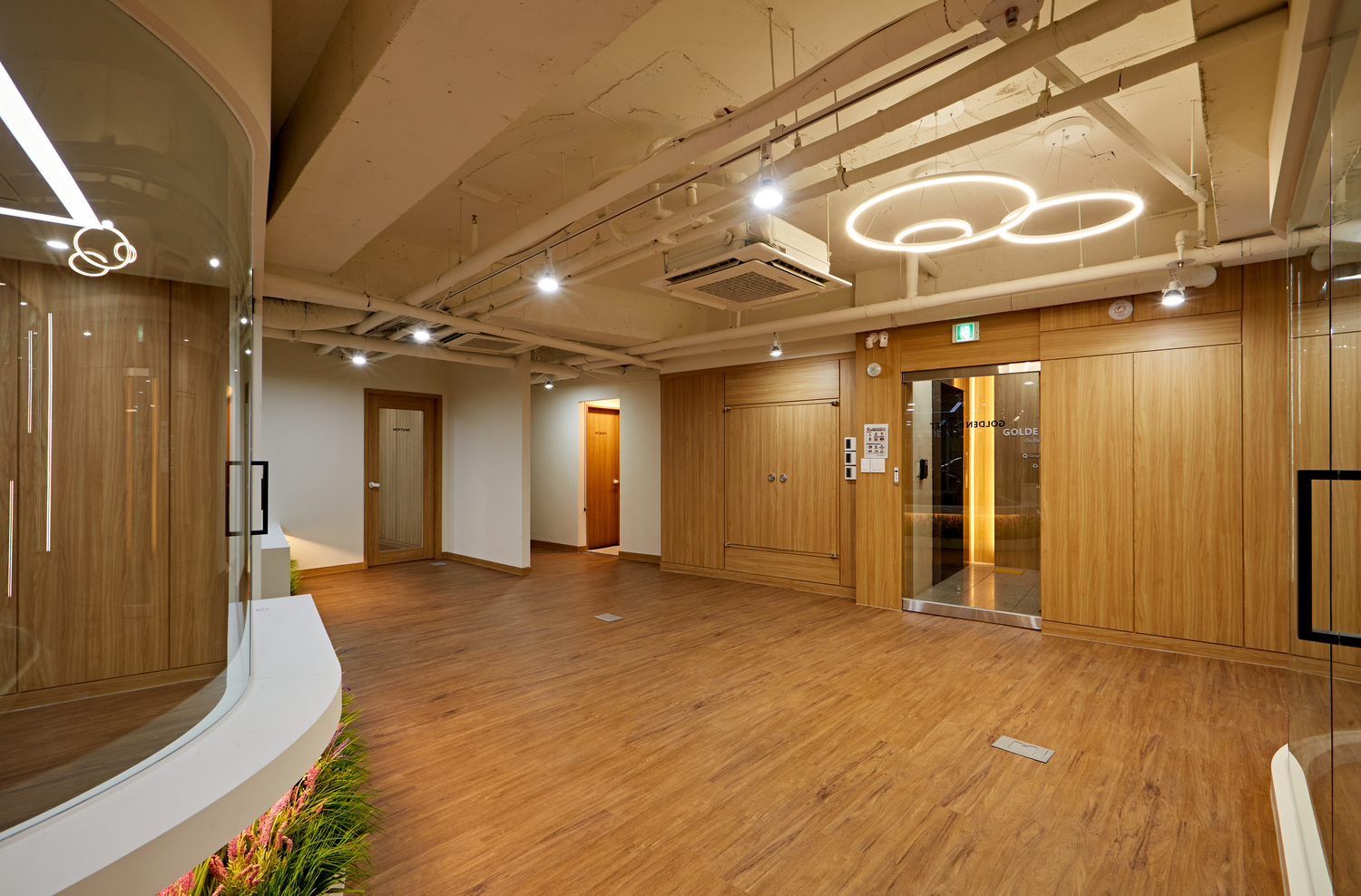 우드 아트월의 후면에는 LED 주광색이 뿜어져나오며 존재감을 나타내고 있었고, 엘리베이터 주변에는 골드 대리석 질감으로 고급스러움을 표현했습니다. 또한 외부에서 내부를 볼때 대부분 따뜻한 온도의 색감으로 조명을 설치하여 아늑해보일 수 있는 조명연출을 사용했습니다.