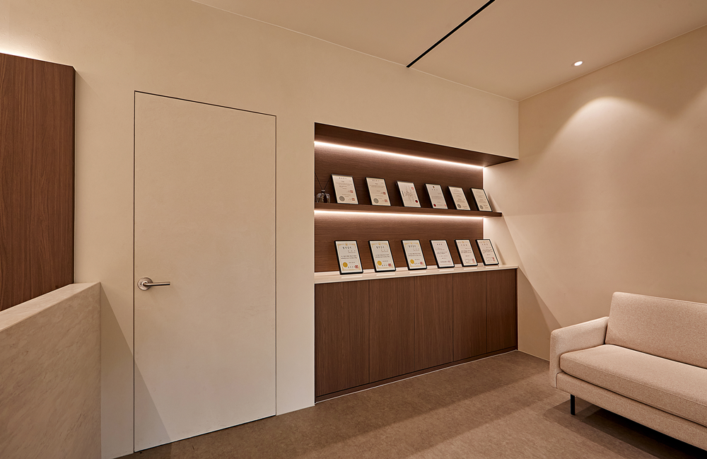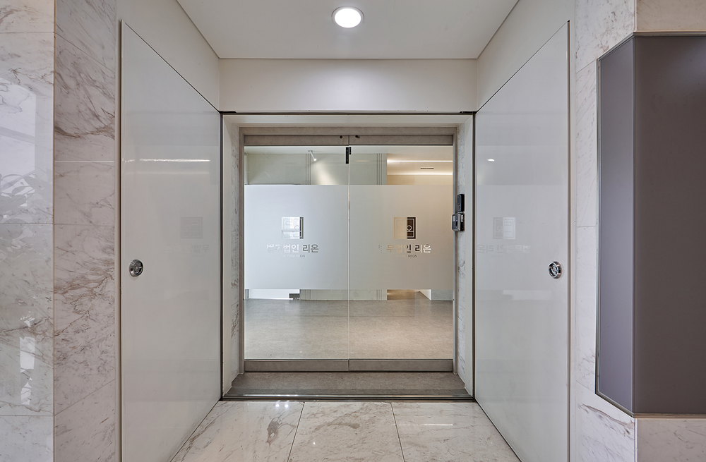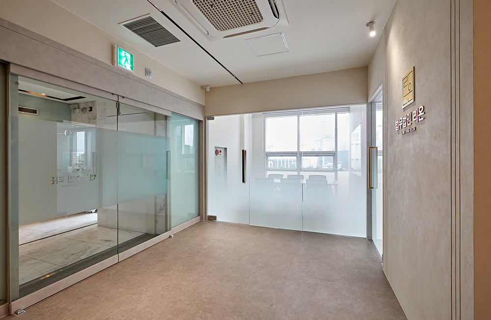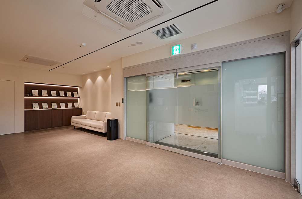 법률사무소를 방문했을 때 가장 먼저 접하게 되는 입구부터 시선을 사로잡아야 합니다. 고급스러운 소재와 조명을 활용하여 세련되고 우아한 분위기를 연출했고,로고나 현판 등을 눈에 띄게 배치하여 전문성을 강조했습니다.