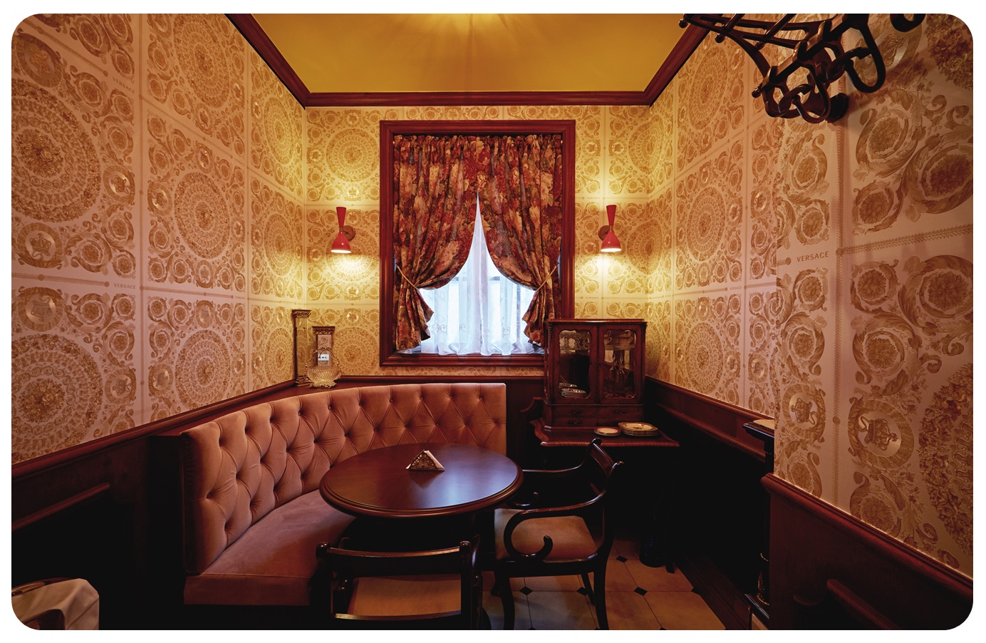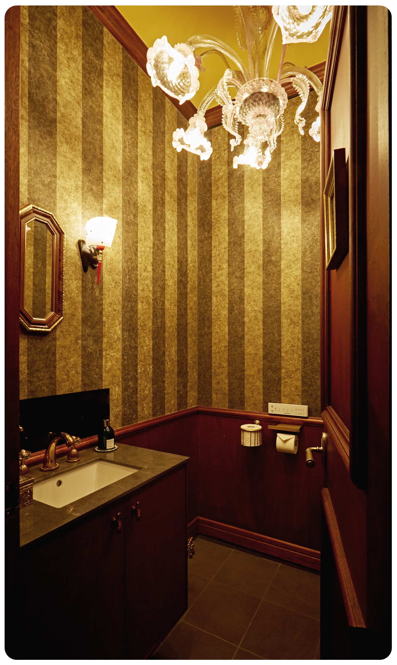특유의 패턴으로 장식된 벽과 고풍스러운 웨인스코팅 기법이 더해져 고급진 공간이 만들어졌죠. 여기에 복도 곳곳에 부착된 브래킷 조명이 분위기의 품격을 높여줍니다.