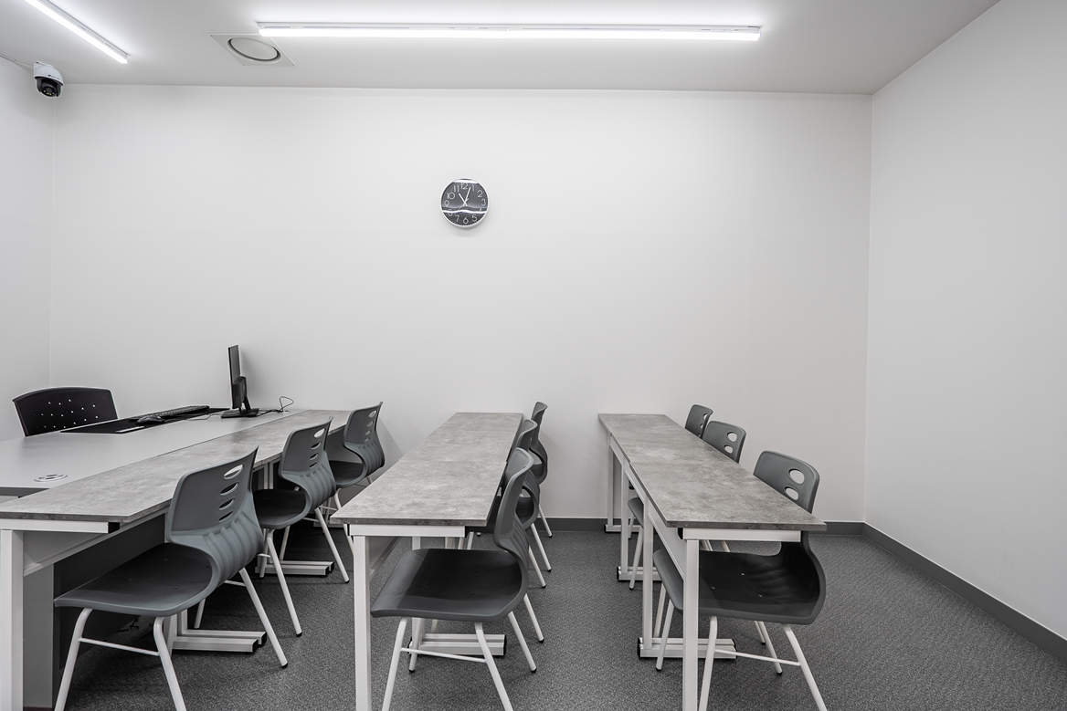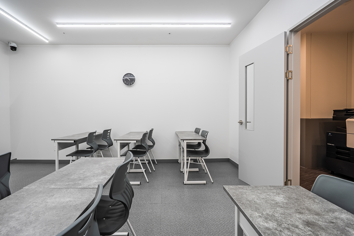 인포데스크와 상담실도 그레이 컬러를 사용하여 모던하고 세련된 분위기를 연출하였으며, 조명을 활용하여 포인트를 주었습니다. 복도에는 벽면에 조명을 활용하여 갤러리 같은 느낌을 주었고, 최대한 군더더기 없이 심플하게 깔끔하게 디자인하였습니다. 이러한 모던하고 세련된 디자인은 학생들의 학습 동기를 유발하고, 학원의 이미지를 높이는 데 큰 역할을 합니다. 또다른 장점으로는 유지보수가 용이하다는 점인데, 블랙과 화이트, 그레이 컬러는 시간이 지나도 질리지 않고, 청소와 관리가 쉽습니다.